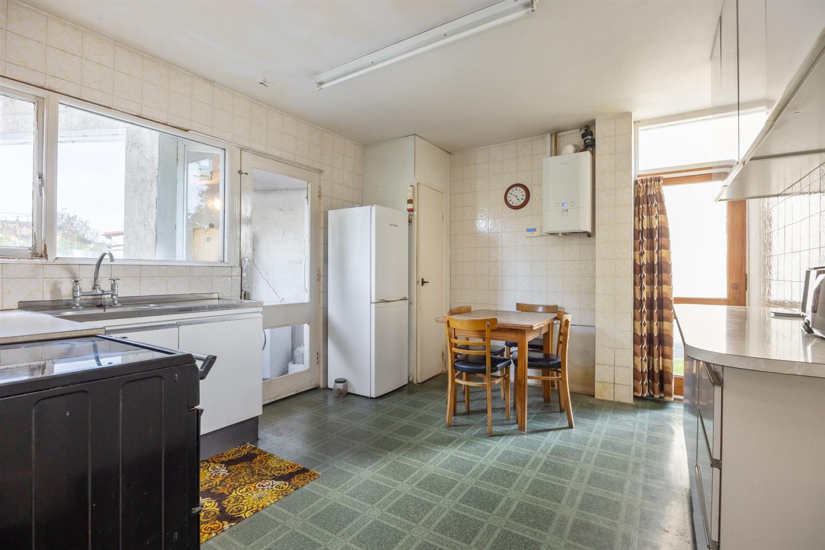 Range of high and low level units, single drainer stainless steel unit with mixer taps, gas fired boiler. Access to: