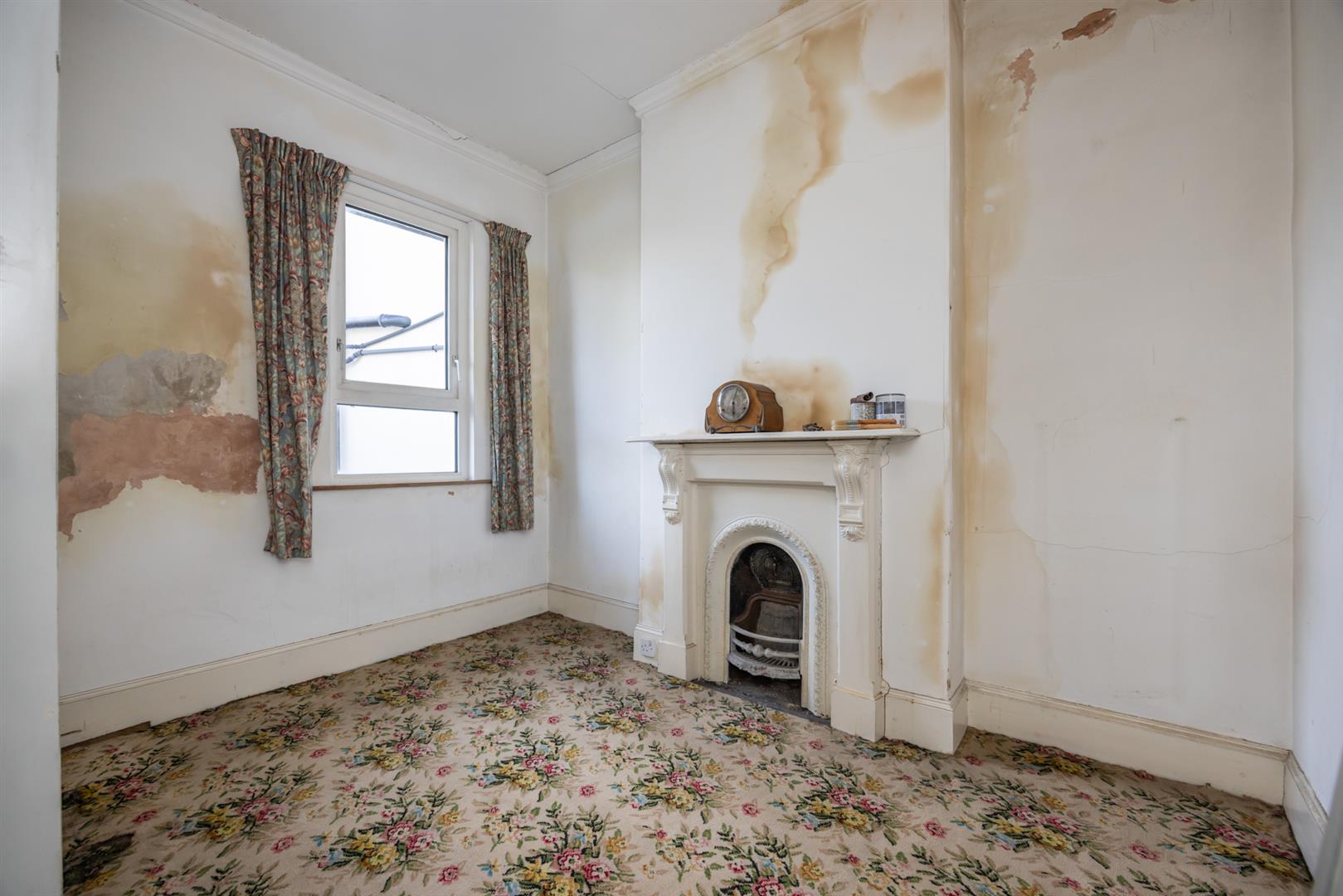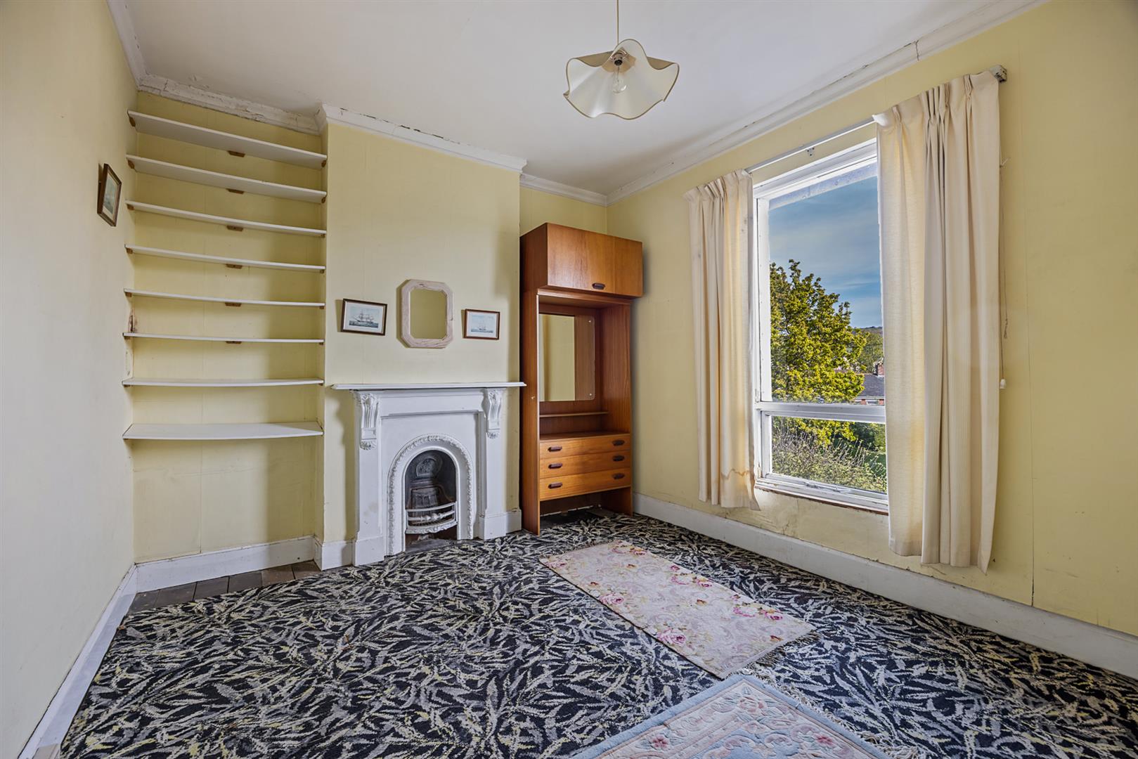Original fireplace with cast iron inset and carved wood surround, cornice ceiling, built in storage cupboard.