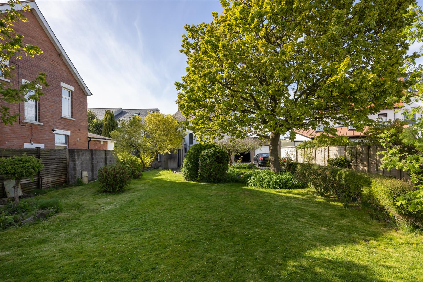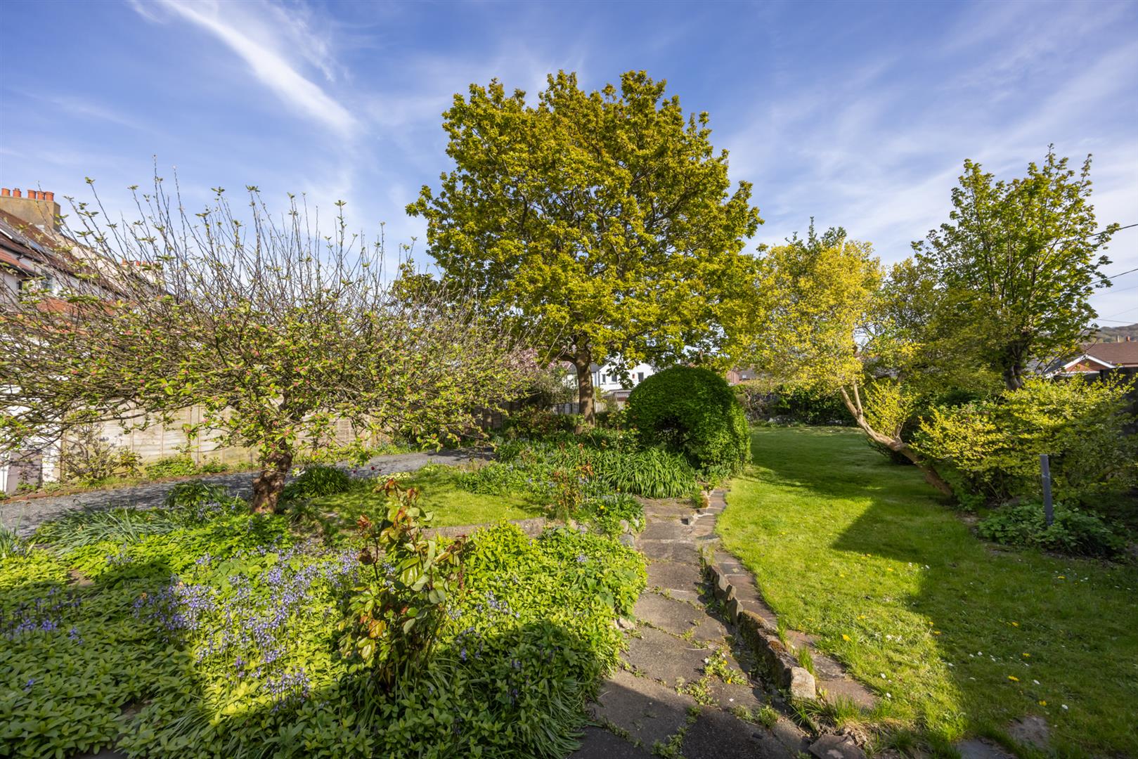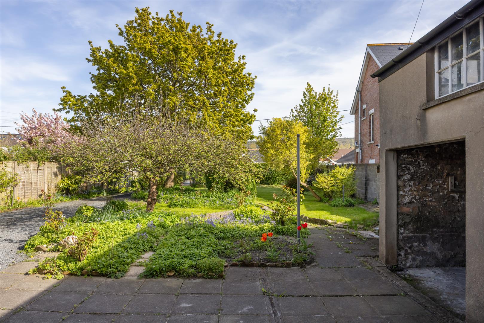 Small area to front in lawn with boundary wall. Generous enclosed rear garden with areas in lawn and paving with mature shrubs and trees, boundary fence and hedging. Access to rear to driveway with ample parking leading to attached double garage.