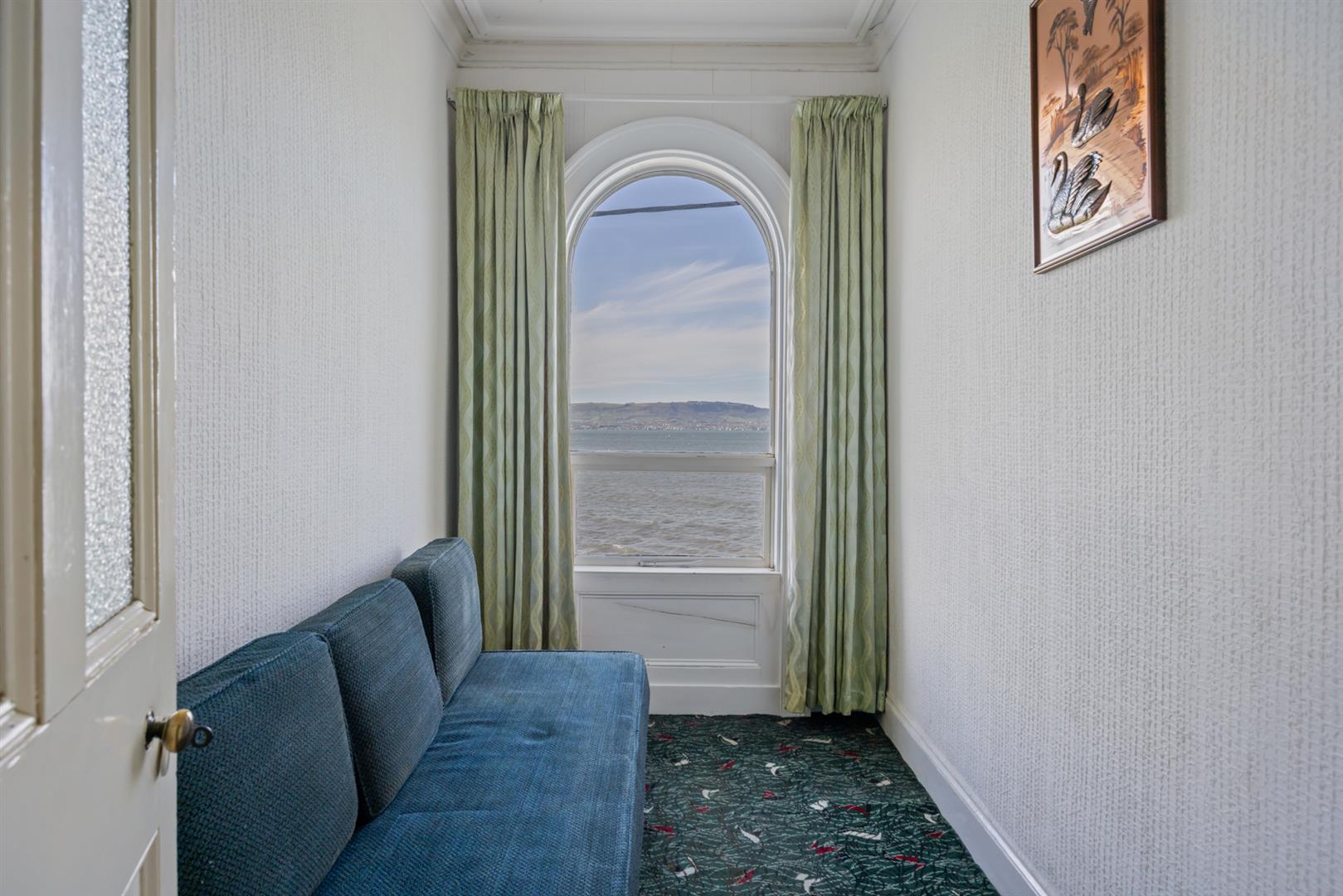 Cornice ceiling, ceiling rose, picture rail, fireplace with cast iron inset, marble surround and slate hearth, uniterrupted sea views.