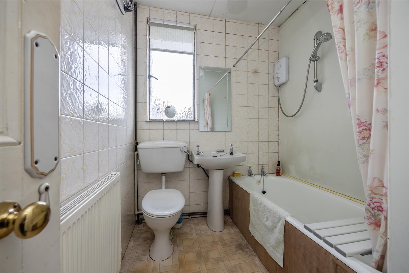 White suite comprising: Panelled bath with electric shower over bath, pedestal wash hand basin, low flush WC.