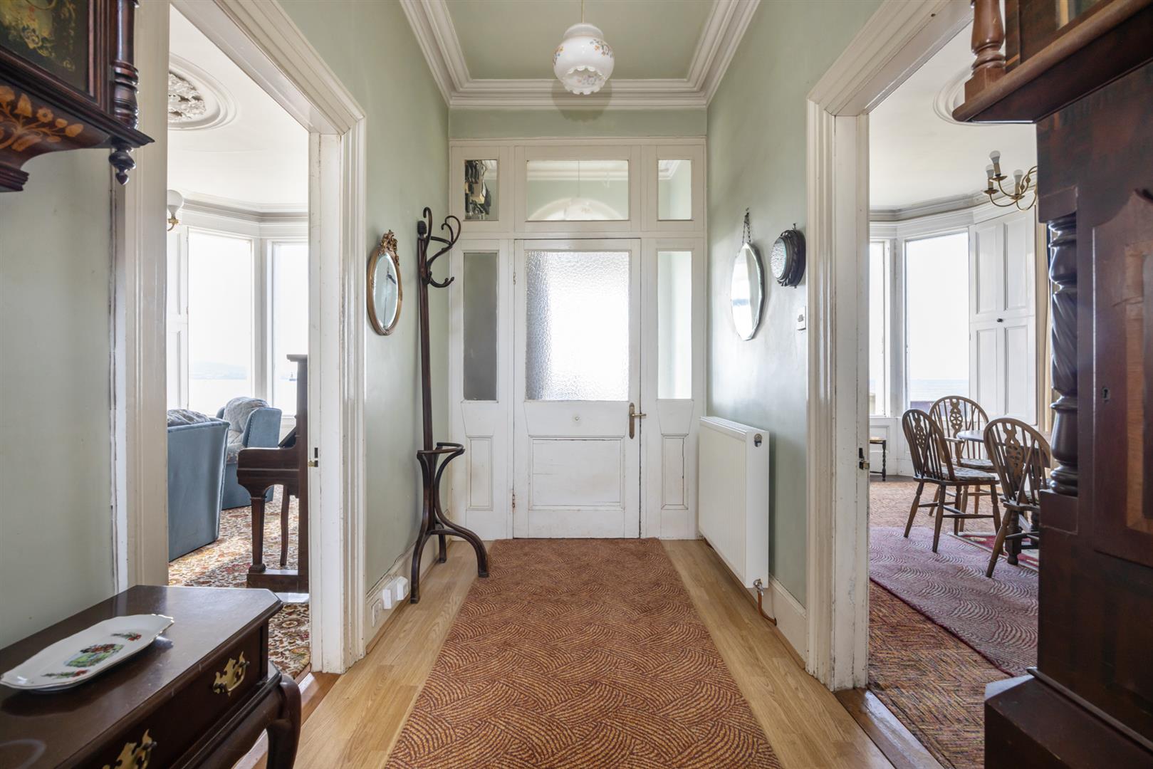 The property opens with an entrance porch leading through an original hardwood door into a welcoming reception porch and hall, both retaining charming period details such as cornice ceilings and wood flooring, with useful storage beneath the stairs. The principal reception rooms are beautifully proportioned, including a magnificent dining room and lounge, each enjoying stunning sea views and featuring original fireplaces with ornate surrounds and ceiling roses. A further living room offers a more intimate space with a carved mahogany fireplace and direct access to the rear garden.