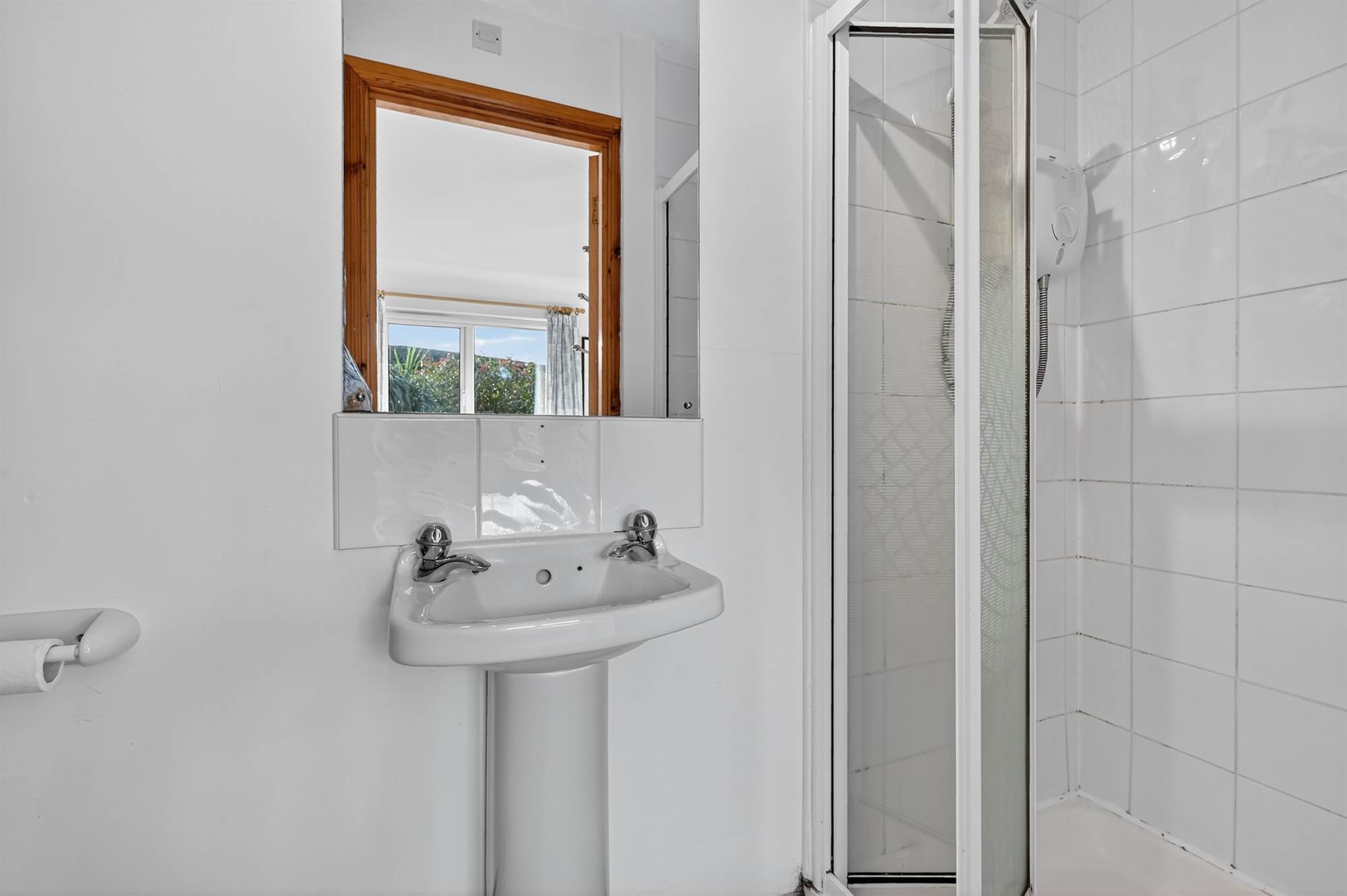 Low flush WC, wash hand basin with chrome taps, part tiled walls, shower enclosure with Mira jump electric shower unit, ceramic tiled floor.