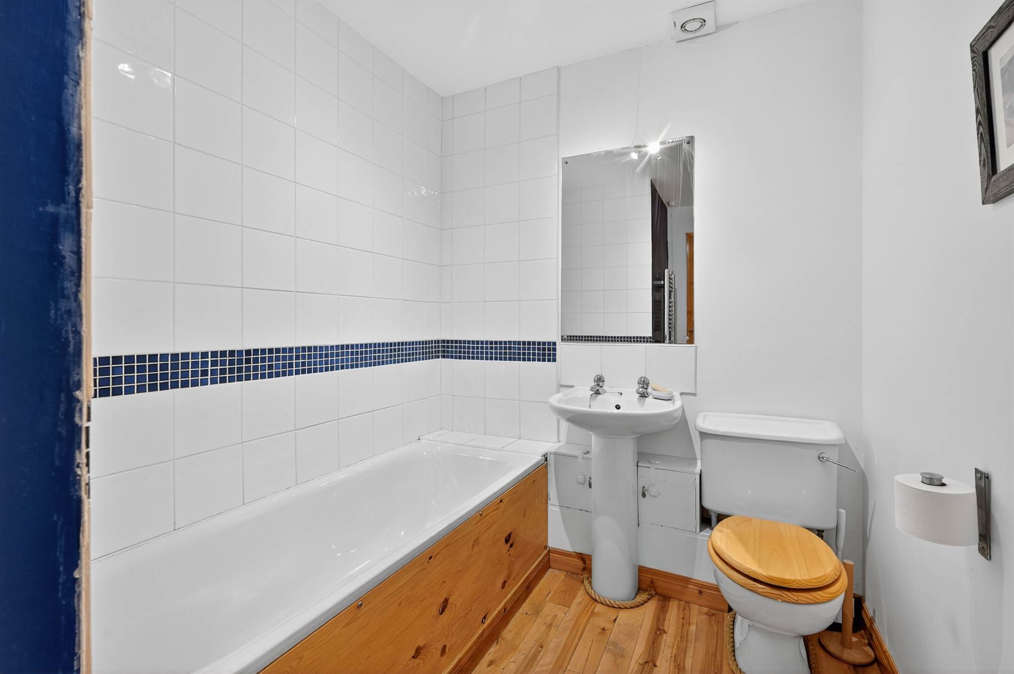 Solid oak wooden floor, heated towel rail, wooden panel bath, low flush wc, pedestal wash hand basin and partially tiled walls.