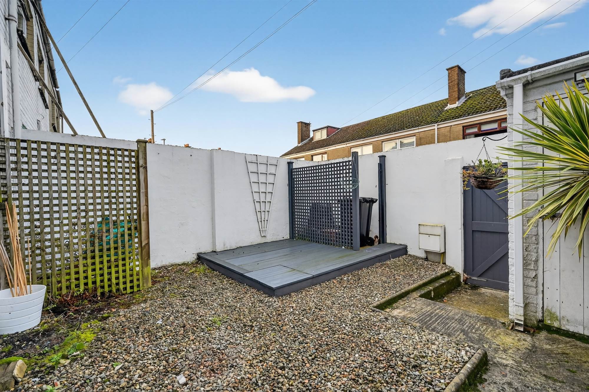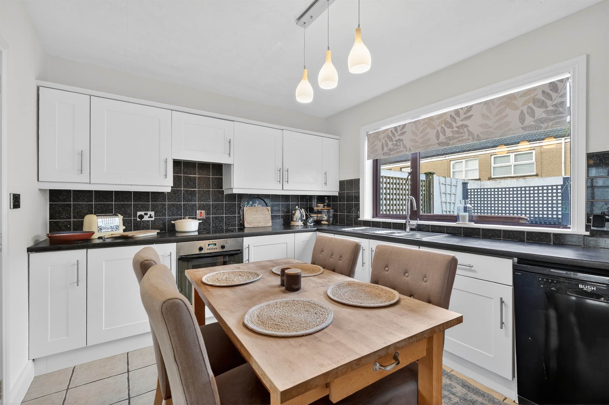 The accommodation comprises a bright and welcoming living room with cast iron fireplace, a modern fitted kitchen with casual dining area, and three well-proportioned bedrooms, white bathroom suite, all complemented by neutral décor and a practical layout. Outside, the property benefits from an enclosed rear garden/patio area, providing a private space for relaxing or entertaining.