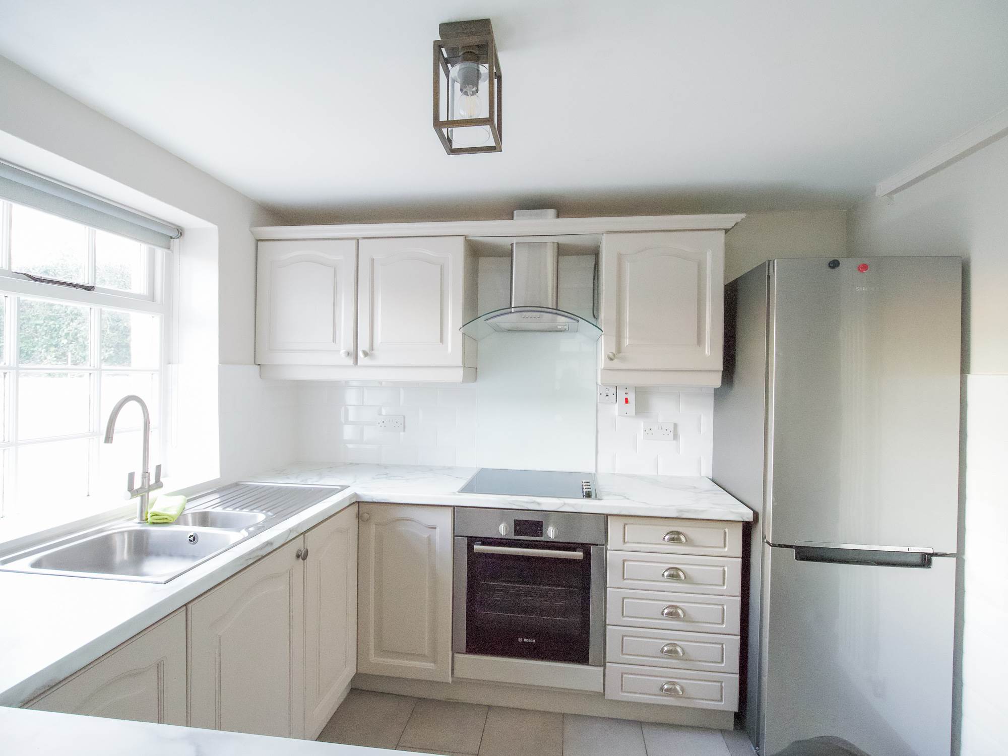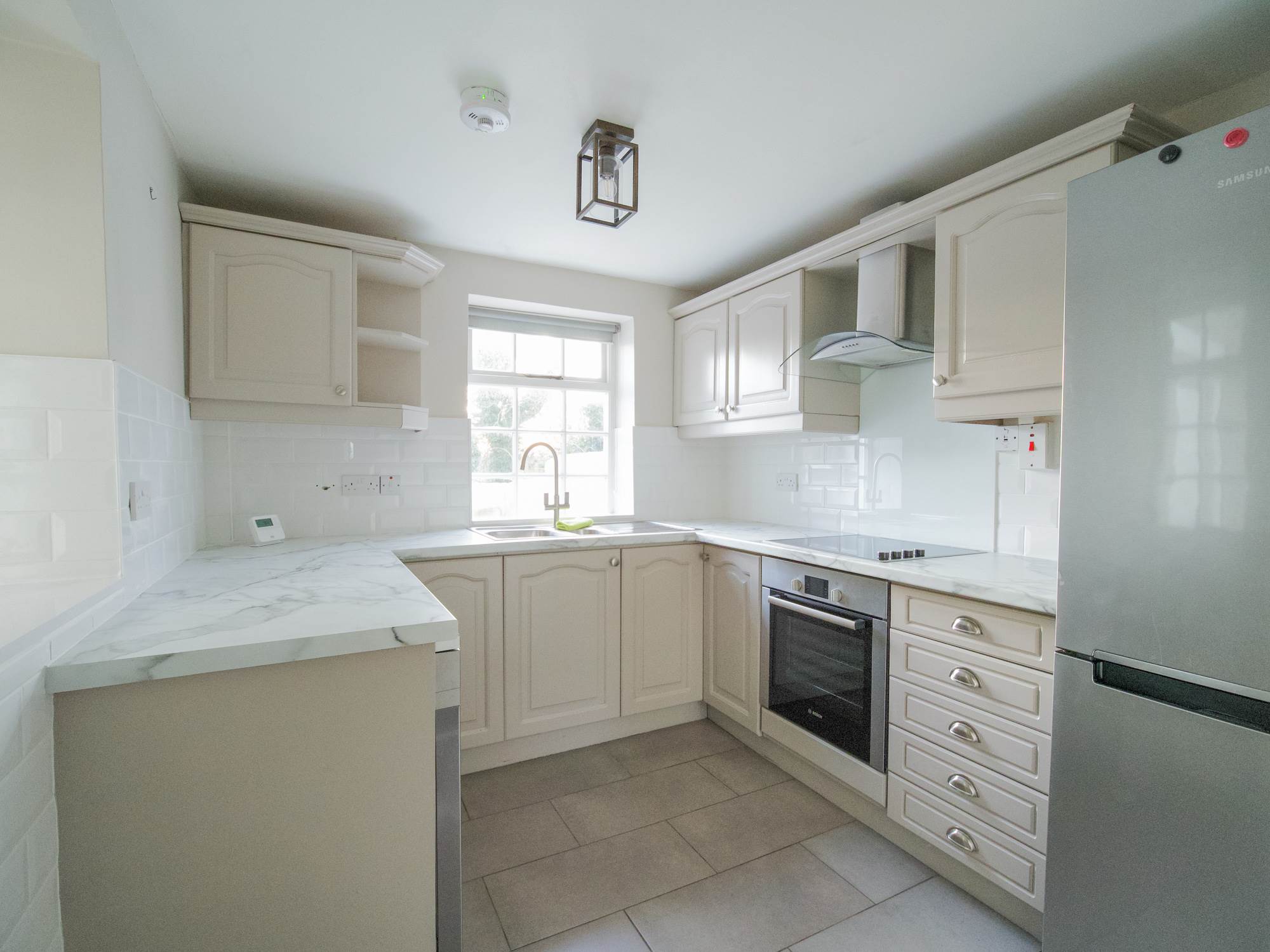 Internally, the home features a bright and spacious open-plan living and dining area leading into a modern, fully fitted kitchen. Upstairs, there are two well-proportioned bedrooms and a stylish bathroom with a contemporary white suite.