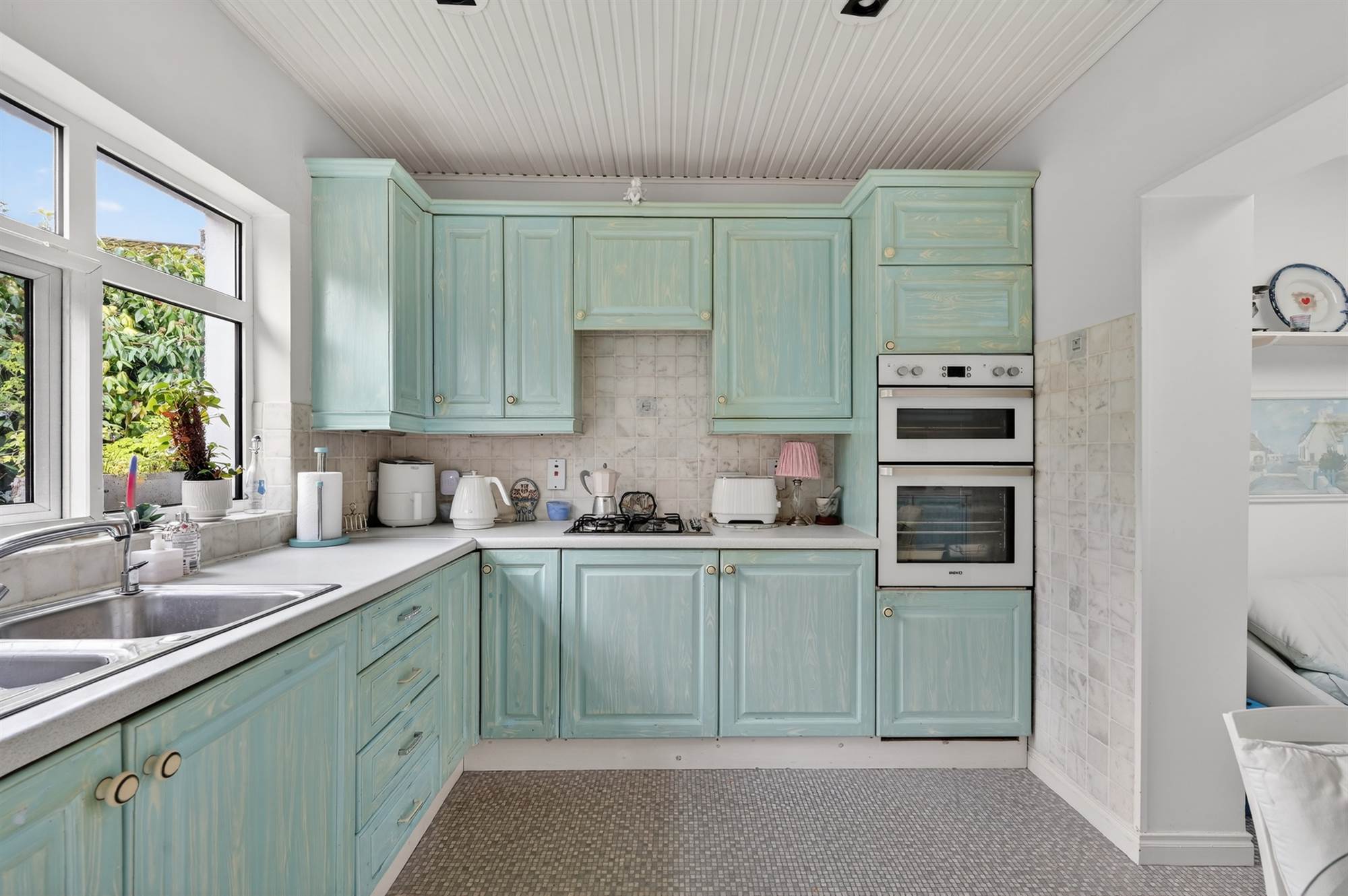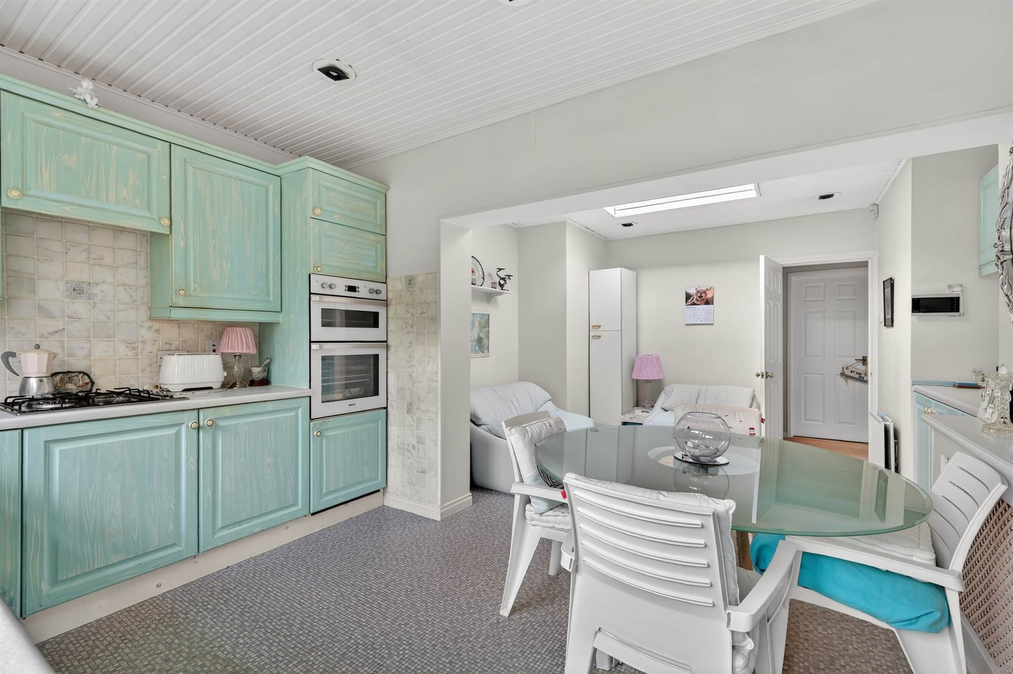 Painted kitchen with excellent range of high and low level units, laminate work surfaces, 1.5 bowl stainless steel sink unit with mixer tap, four ring gas hob, Beko electric double oven, fridge freezer, integrated dishwasher, spotlighting, uPVC door to outside.