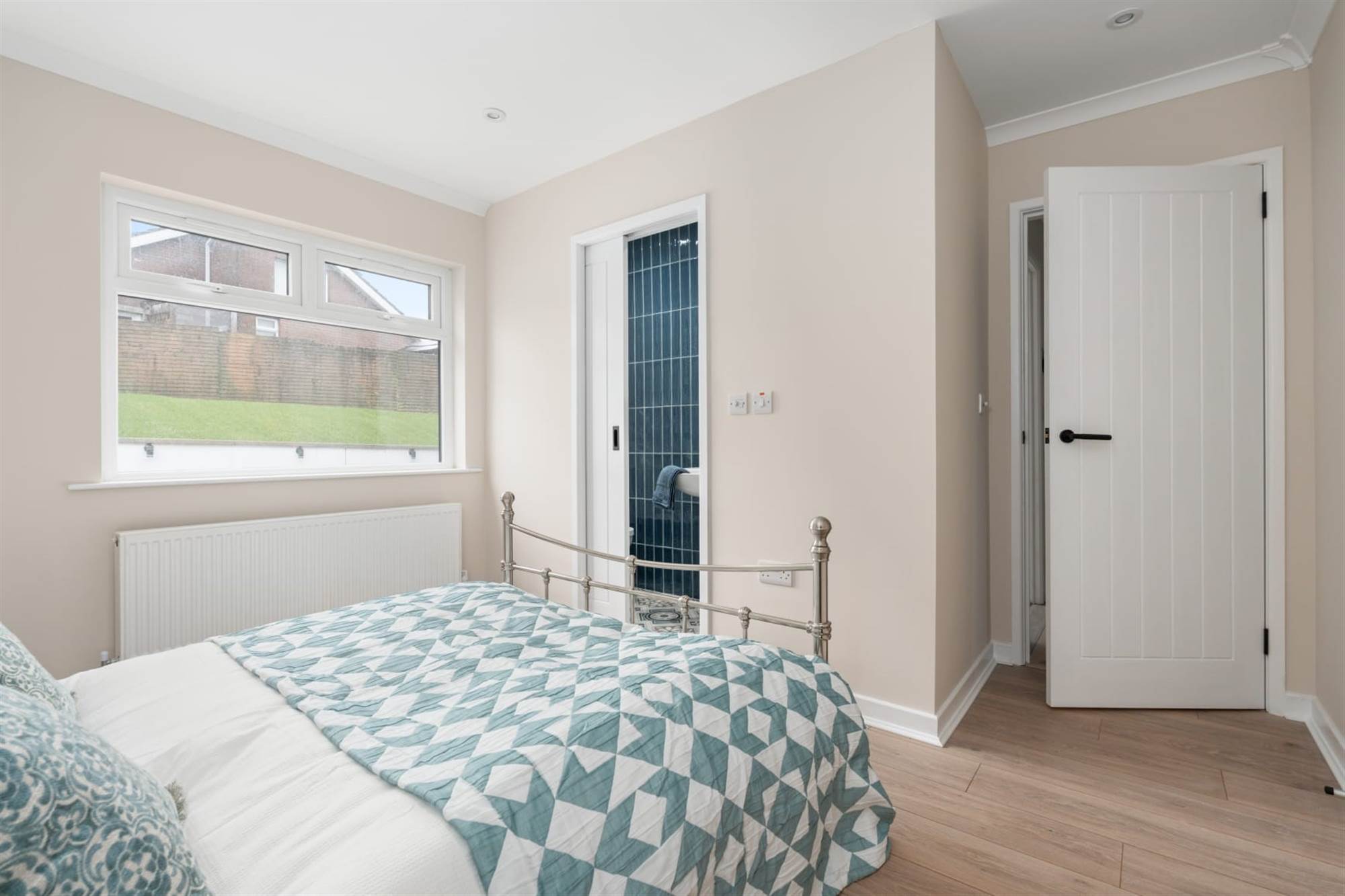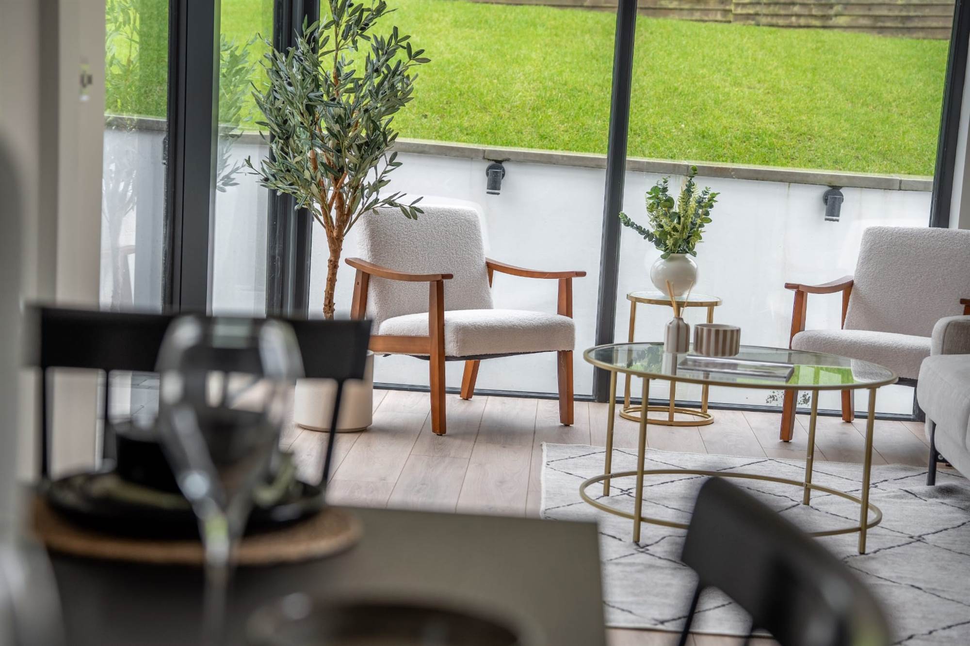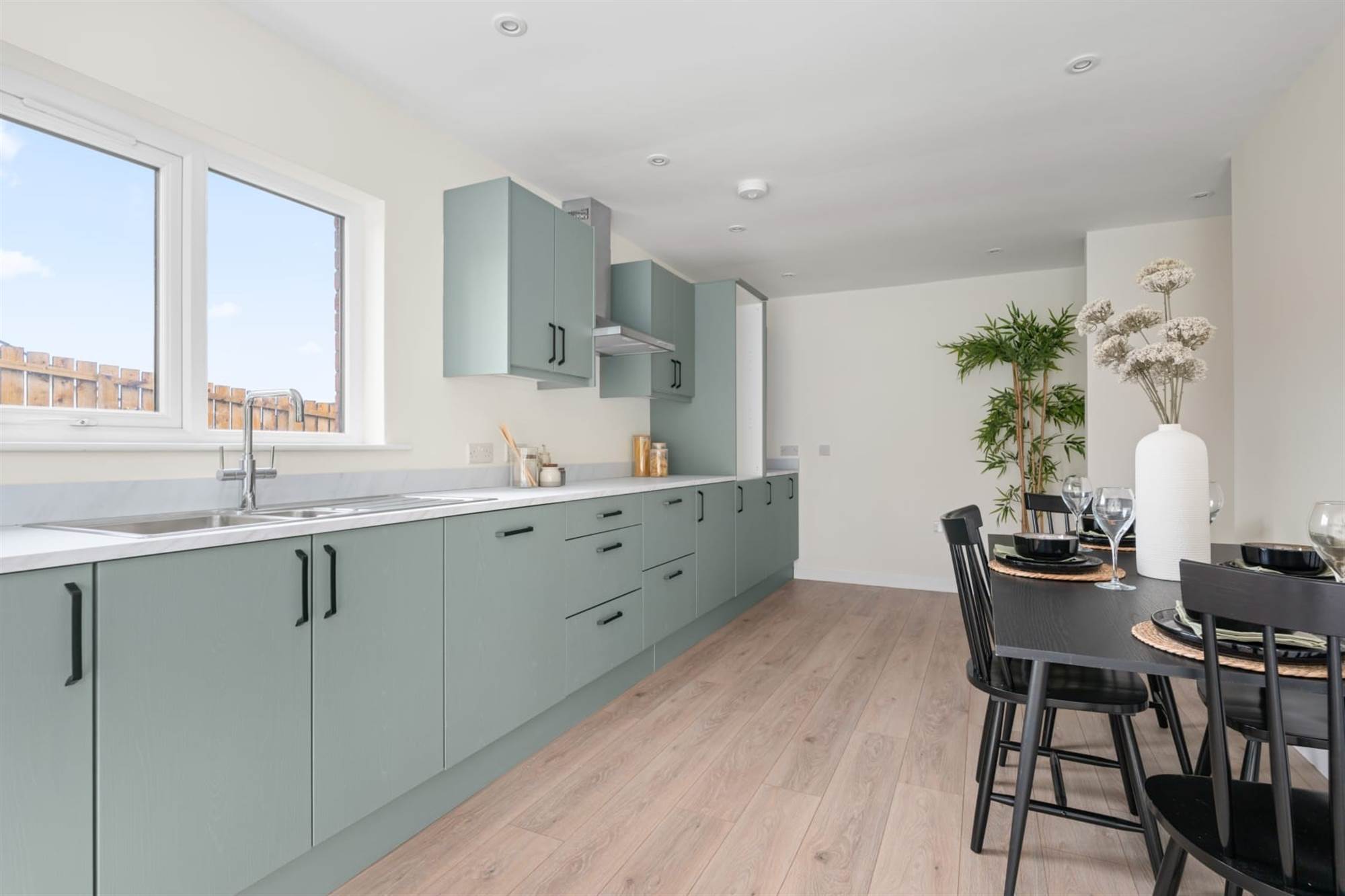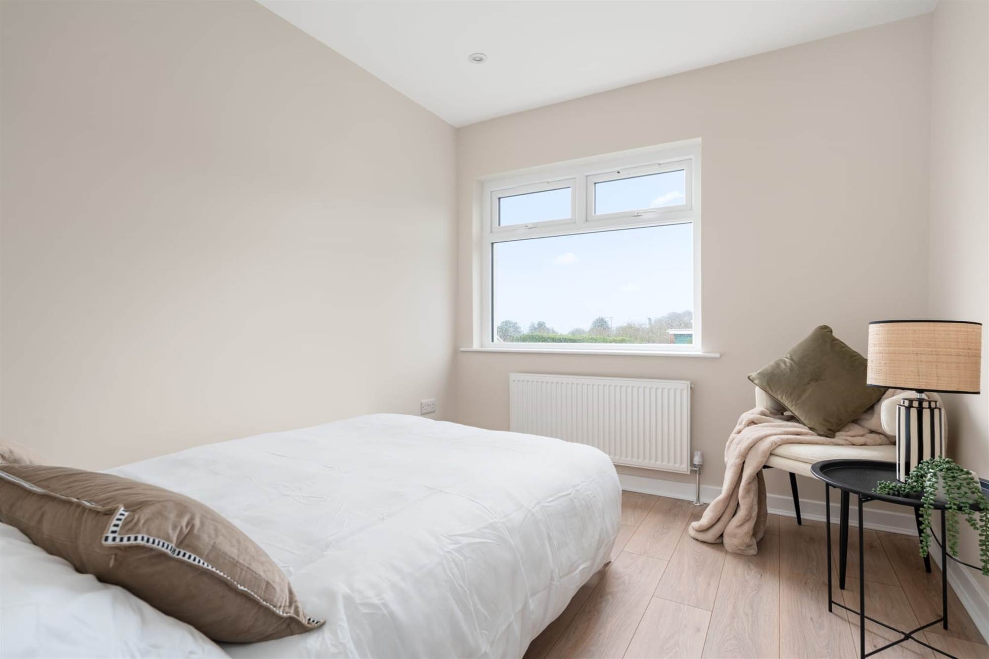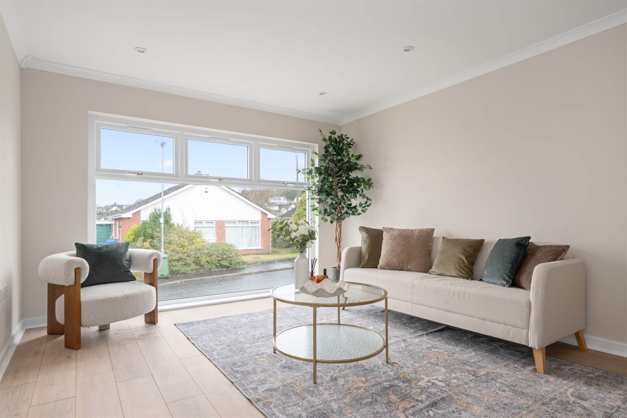 Light oak wood effect laminate flooring, uPVC double glazed picture window.