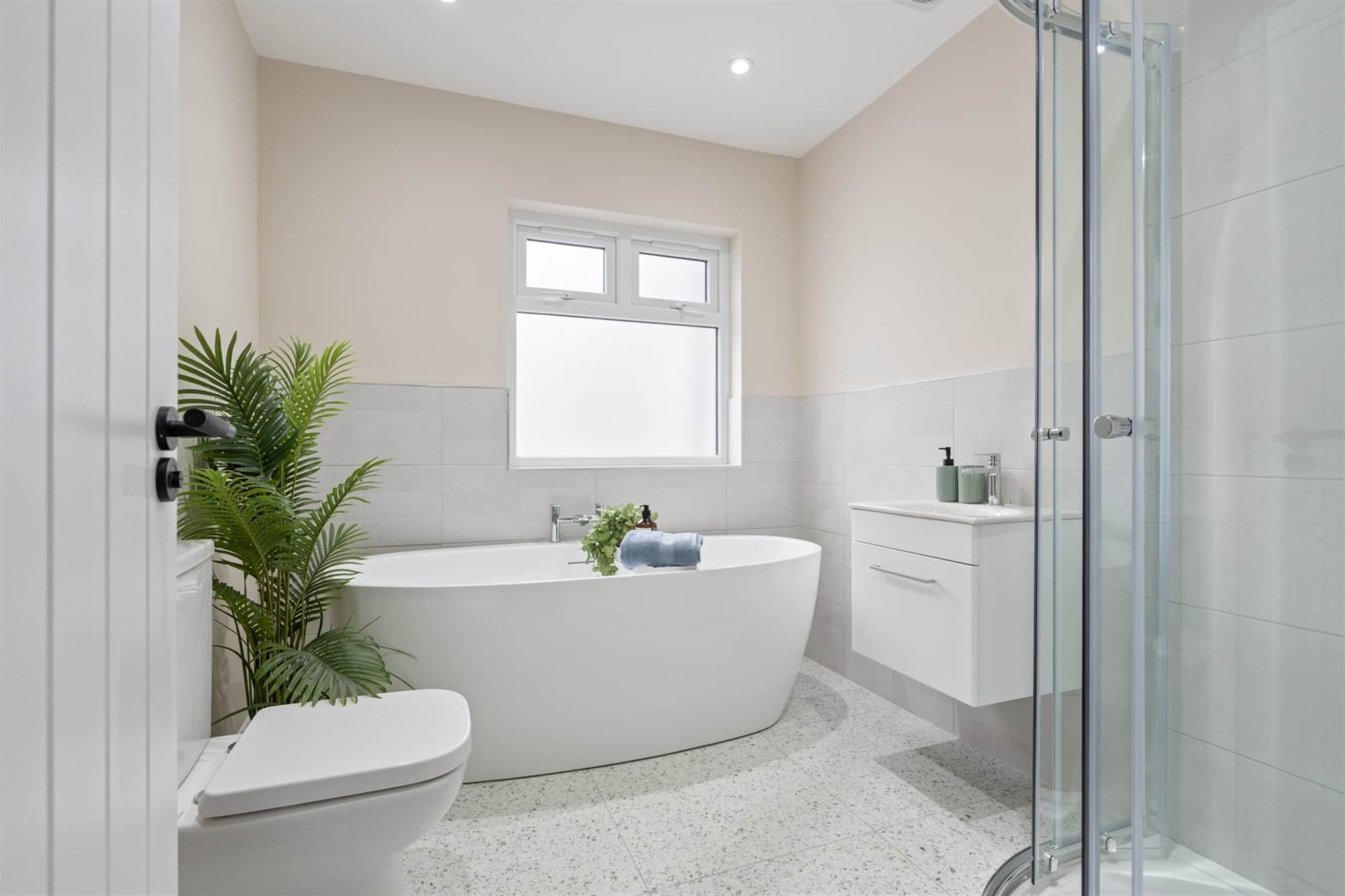 White suite comprising free-standing bath with mixer tap, vanity unit with mixer tap, low flush wc, fully tiled built-in shower cubicle with overhead shower and shower attachment, part tiled walls, recessed spotlighting.