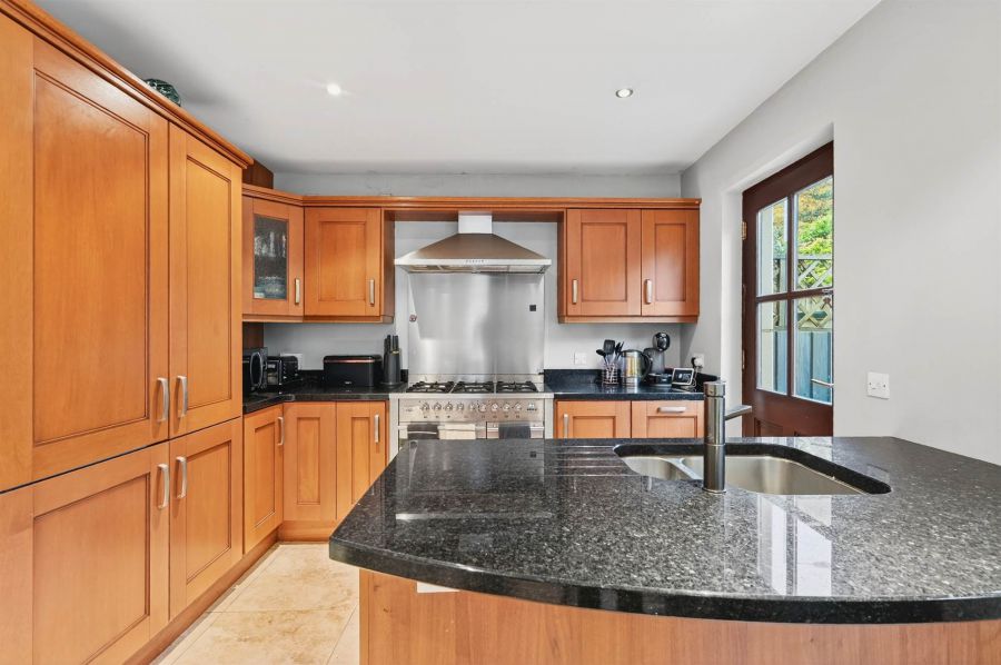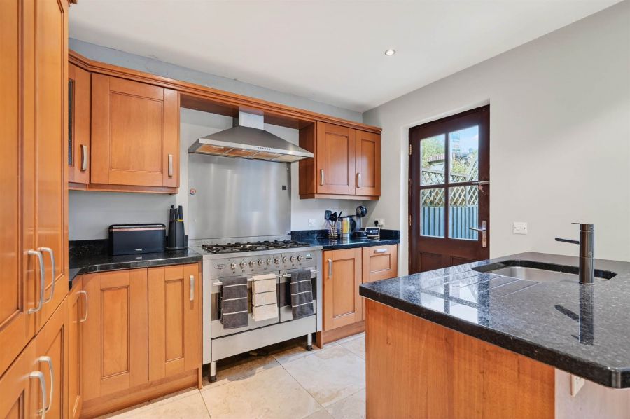 Extensive range of high and low level units, granite worktops, island unit with granite worktop, stainless steel sink unit with vegetable basket and mixer tap, concealed lighting, ceramic tiled floor, extractor fan, integrated fridge and freezer, access to garden.