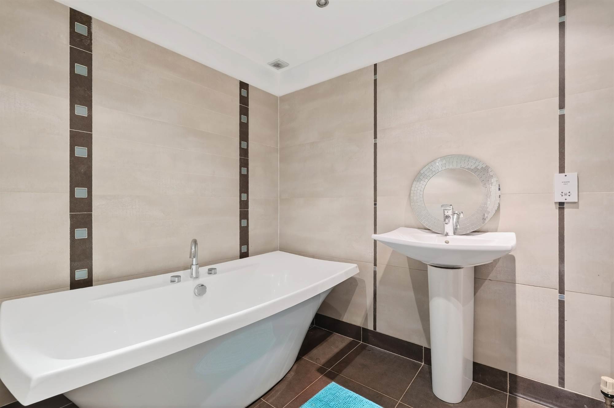 Modern white suite comprising free standing bath with mixer tap, pedestal wash hand basin, close coupled low flush wc, fully tiled built-in shower cubicle, ceramic tiled floor, electric shaver point.
