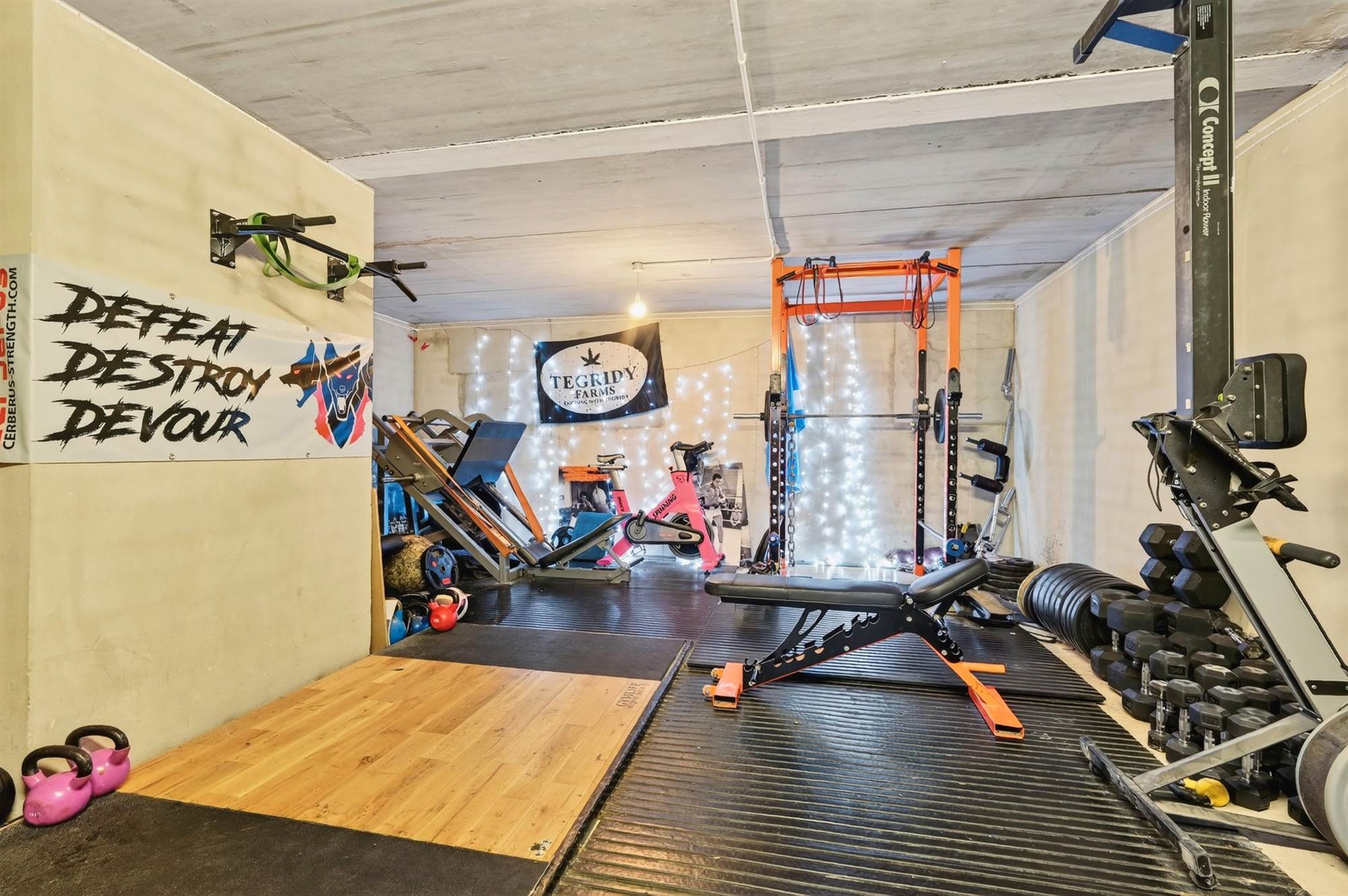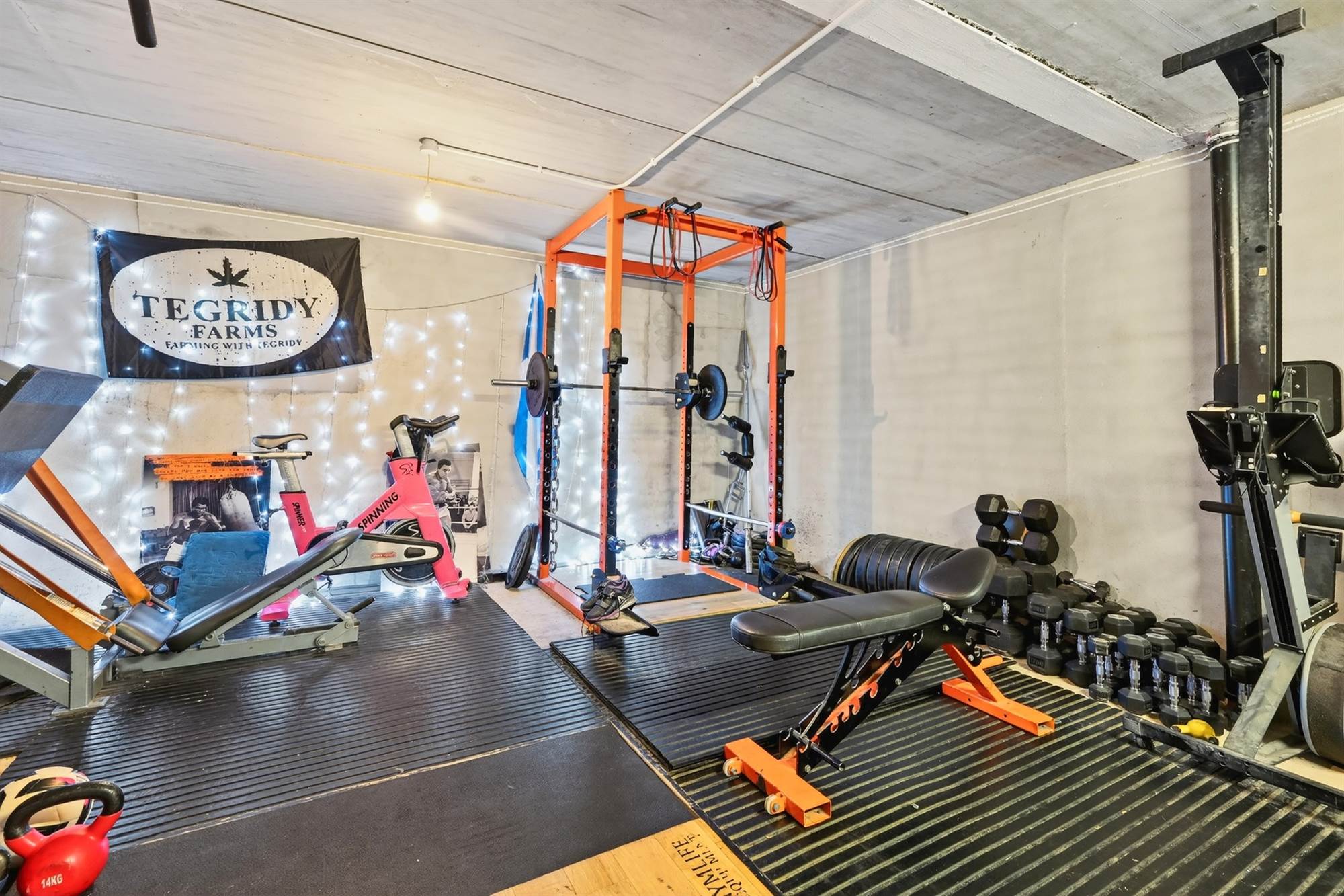 Spacious garage with electric door (currently used as a home gym)