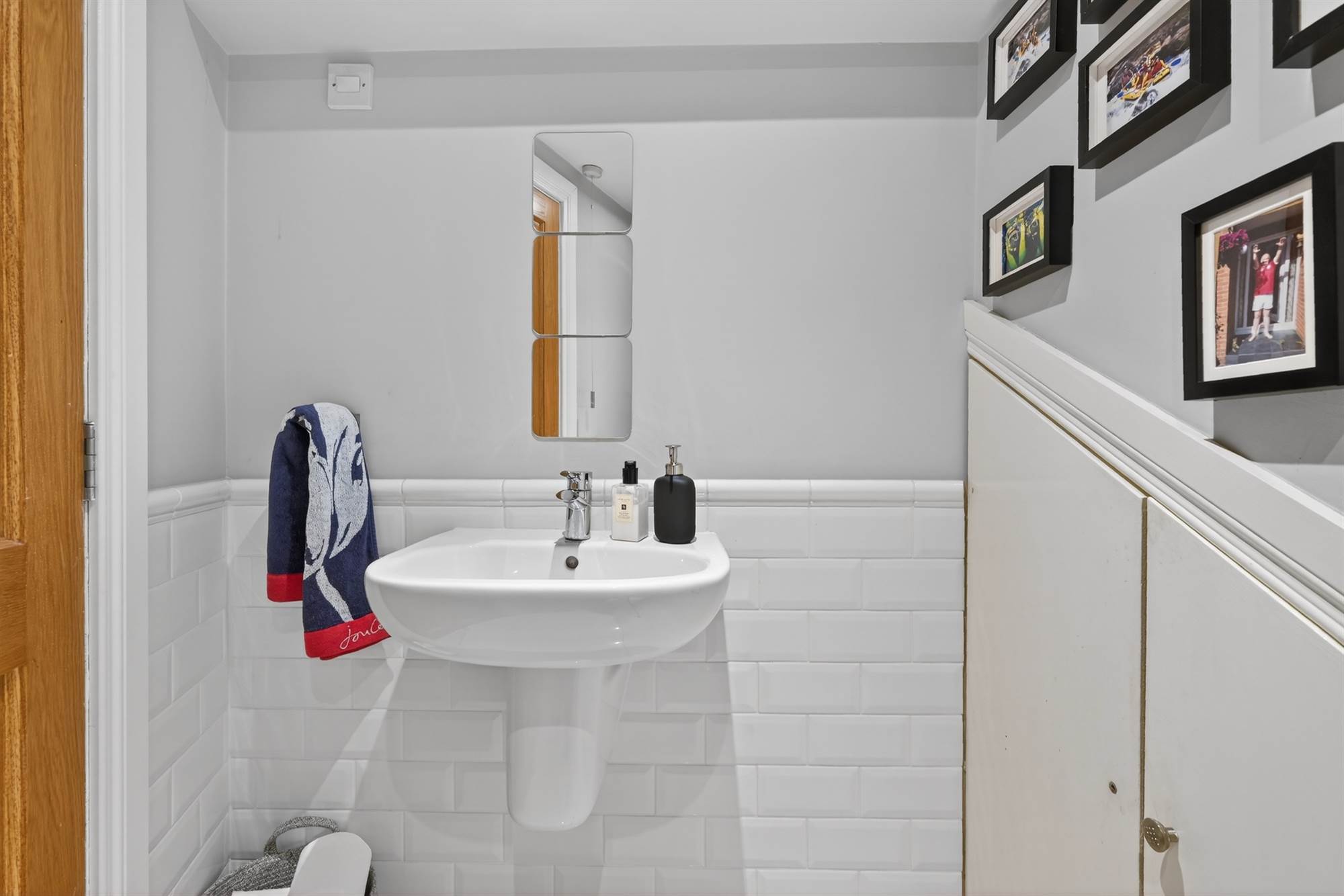 Low flush wc, wash hand basin with mixer tap, subway tiled walls, ceramic tiled floor, extractor fan, storage cupboard understairs.
