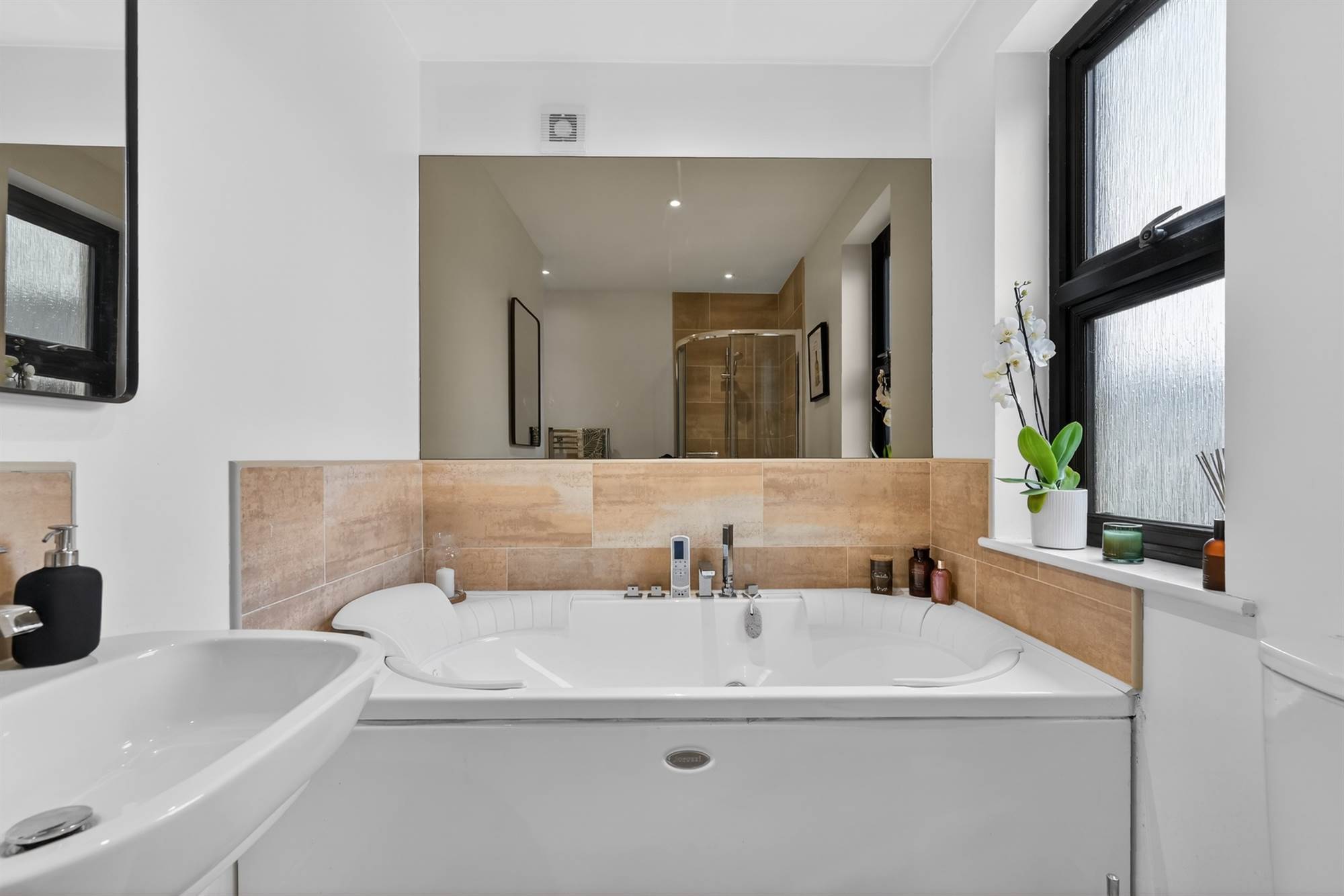 Modern white suite comprising jacuzzi style panelled bath with mixer tap and hand shower, wall mounted wash hand basin with mixer tap and tiled splashback, fully tiled built-in shower cubicle with pressurised shower, low flush wc, wall mounted storage, ceramic tiled floor, chrome radiator, extractor fan, window.