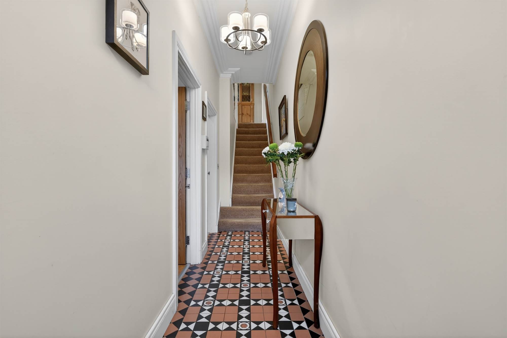 Victorian style tiled floor, cornice ceiling, ceiling rose.