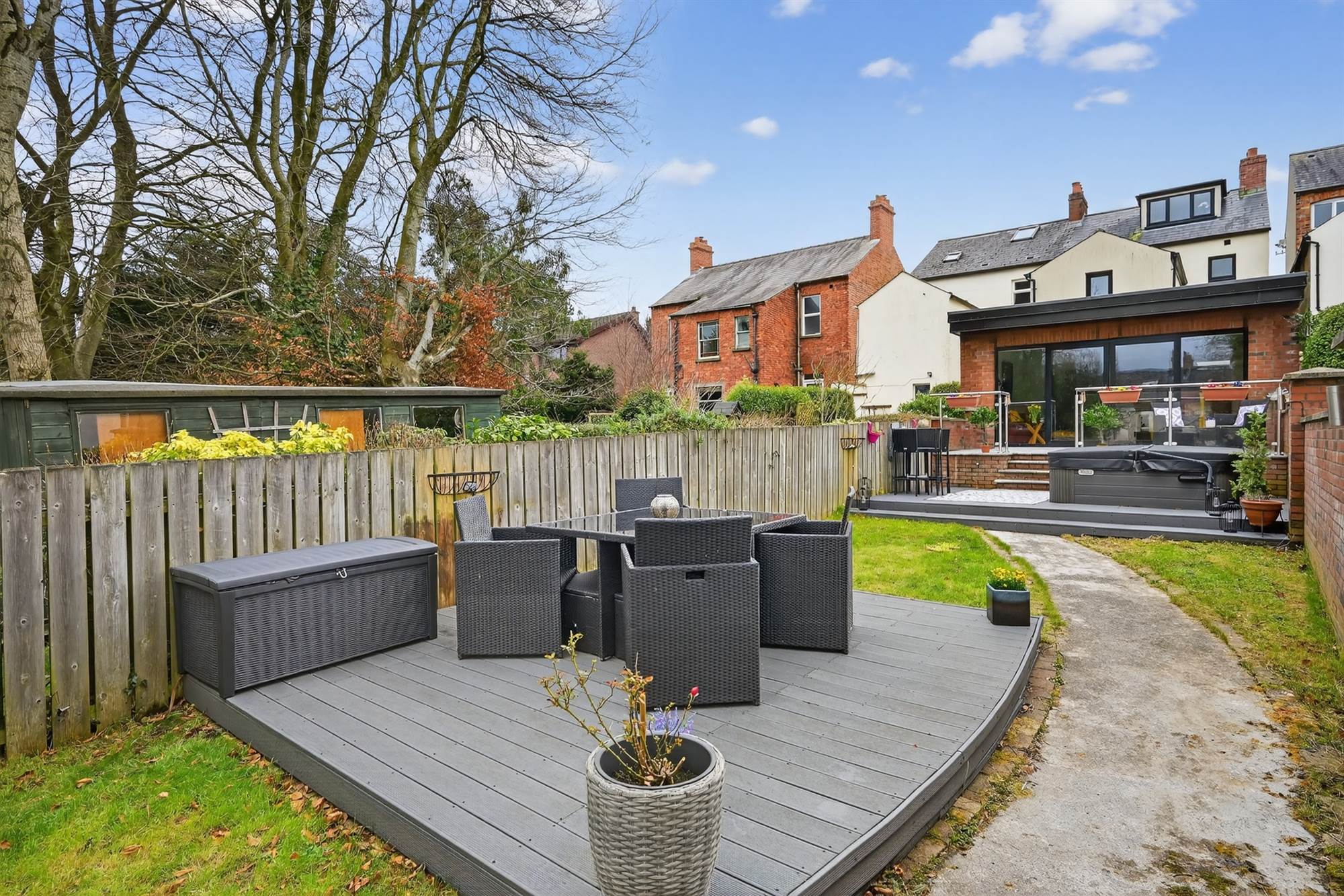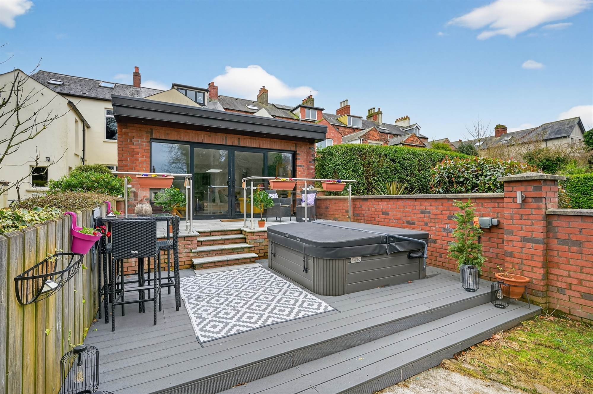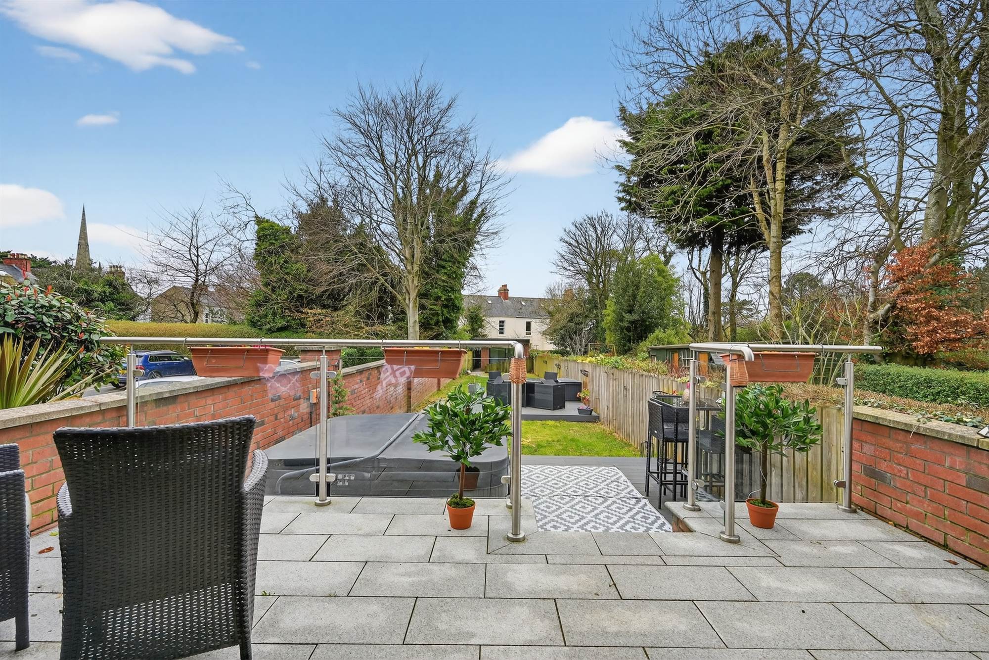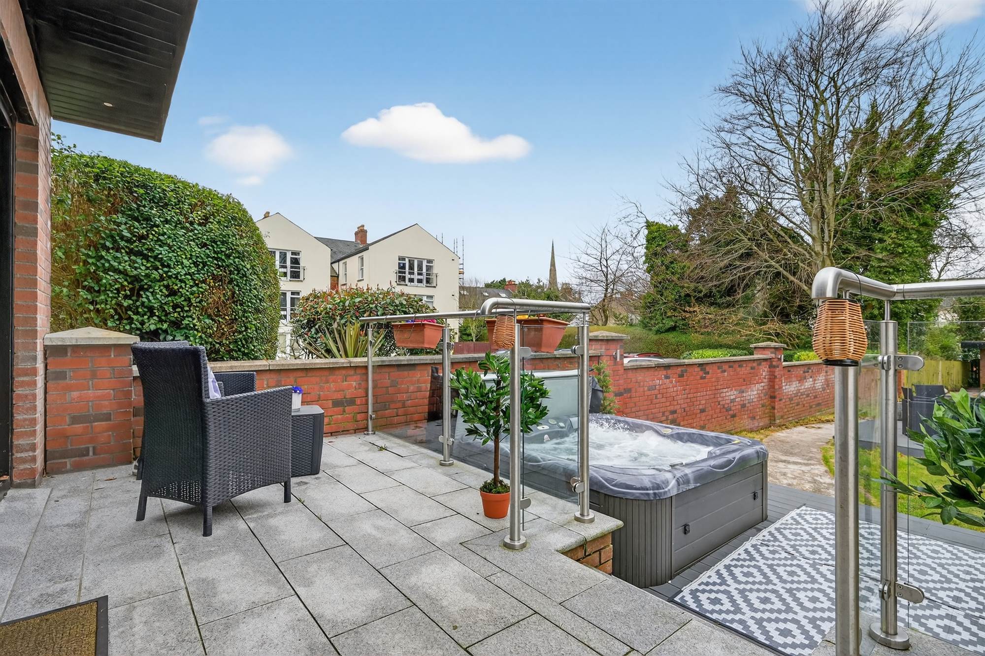 Tarmac driveway with ample private parking. Enclosed, good sized gardens in lawn benefitting from sunny south west aspect. The family room area opens onto a granolithic paved patio with stainless steel glazed ballustrade and soffit lighting. Granite steps lead to composite decked area with hot tub. There is a second composite seating area in the centre of the garden. Enhanced exterior wall lighting in garden. Pedestrian access to Church Road via back gate via Riverside Terrace.