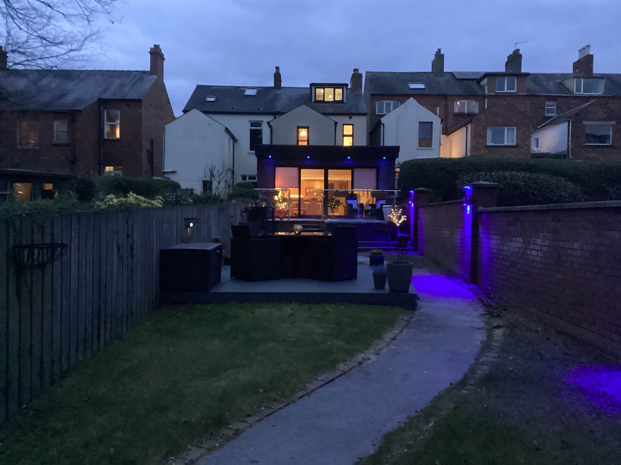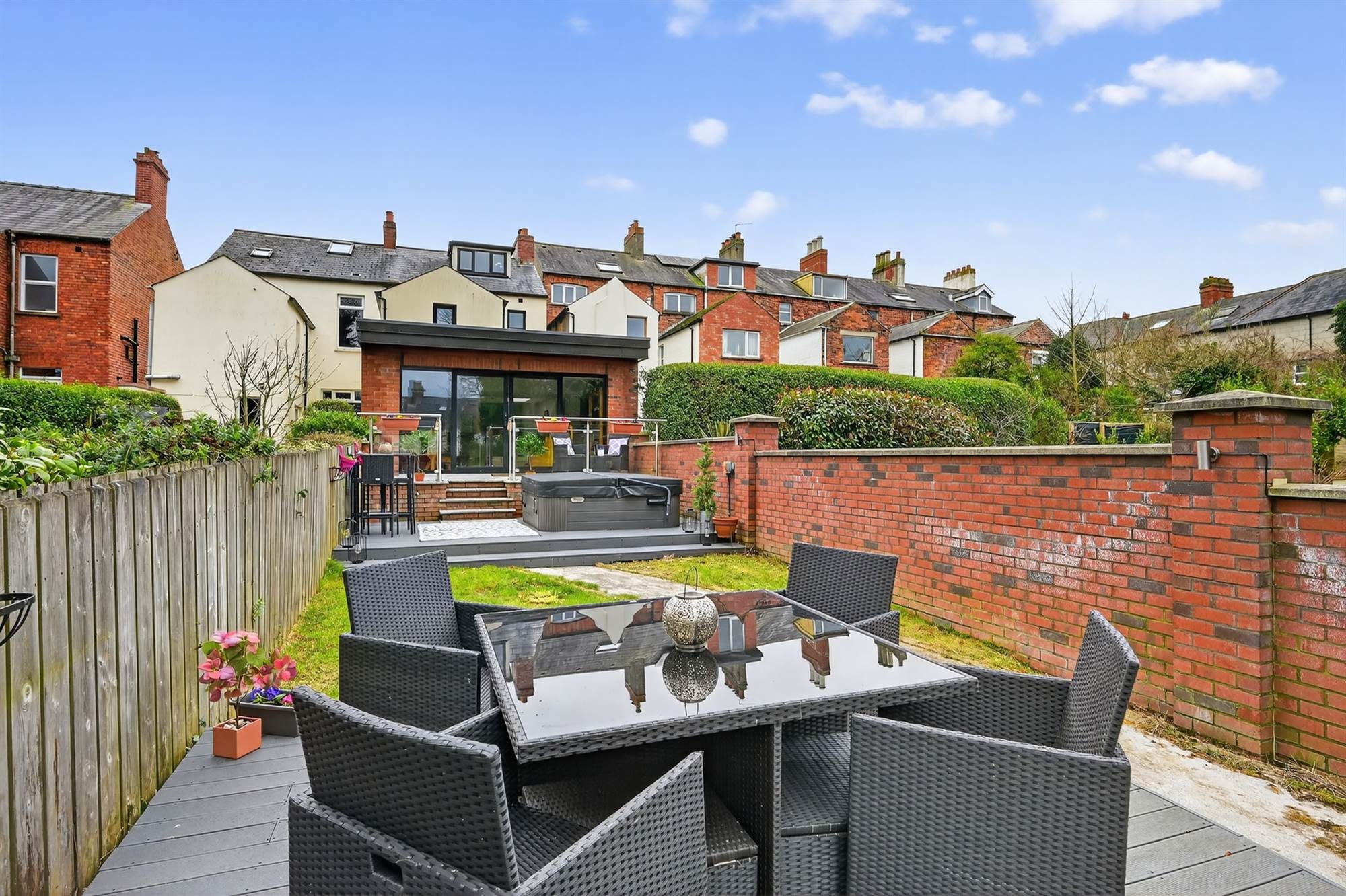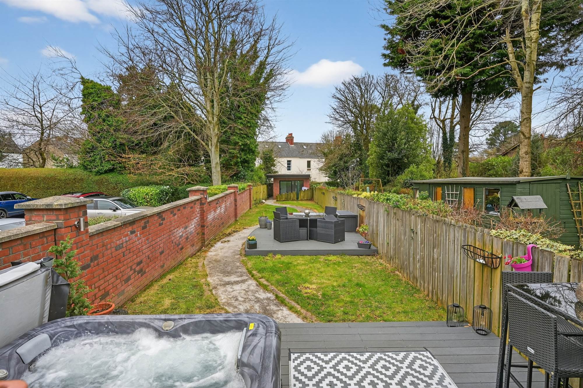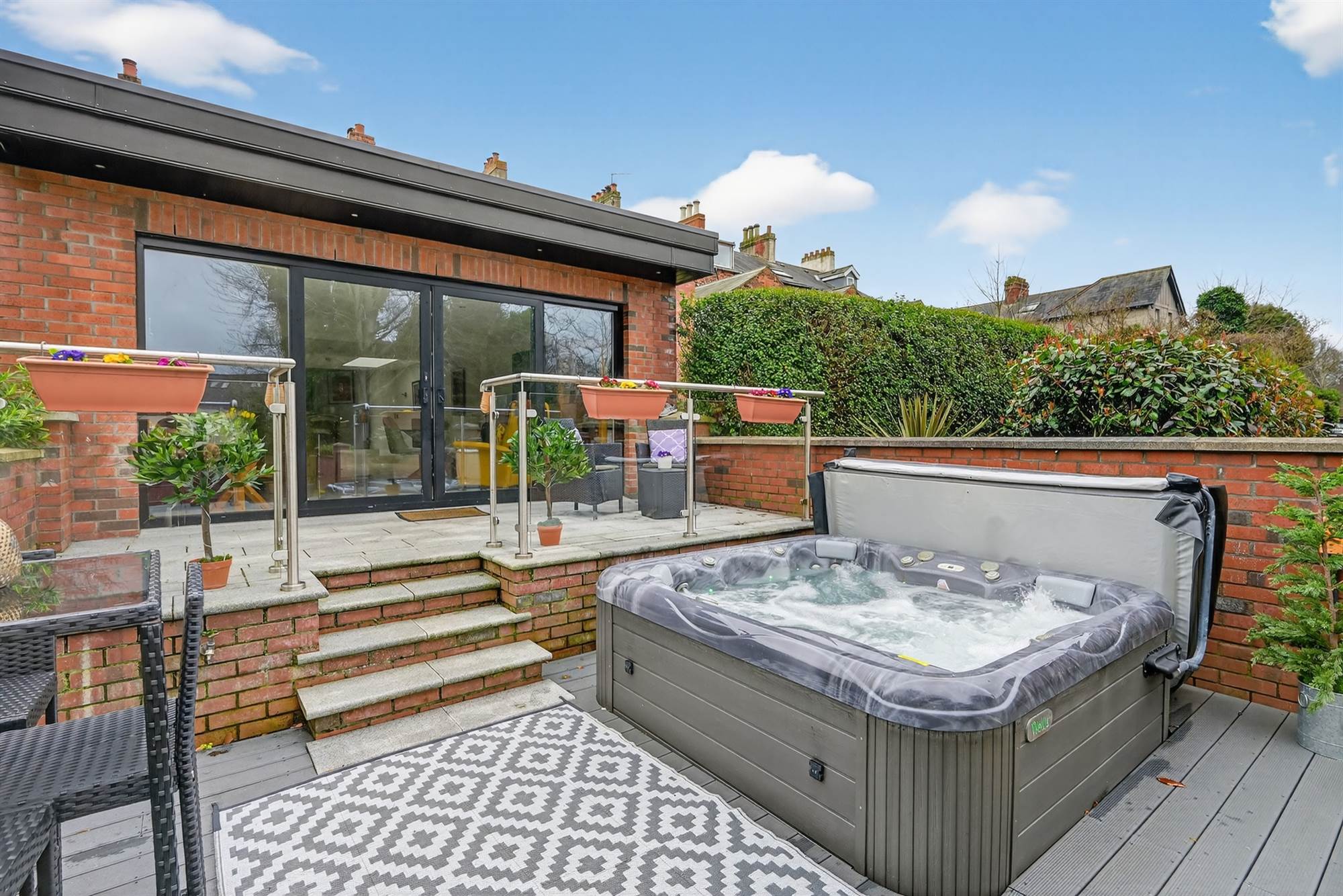 Tarmac driveway with ample private parking. Enclosed, good sized gardens in lawn benefitting from sunny south west aspect. The family room area opens onto a granolithic paved patio with stainless steel glazed ballustrade and soffit lighting. Granite steps lead to composite decked area with hot tub. There is a second composite seating area in the centre of the garden. Enhanced exterior wall lighting in garden. Pedestrian access to Church Road via back gate via Riverside Terrace.
