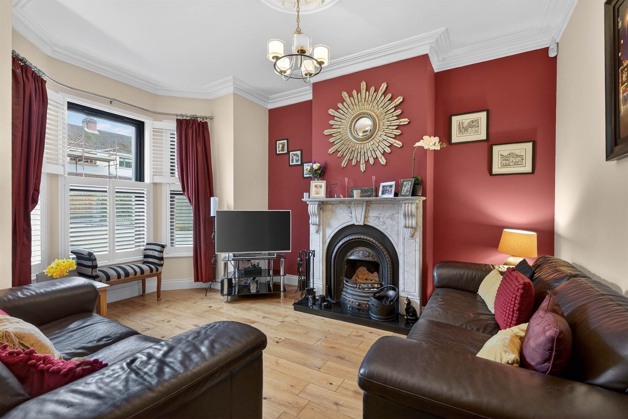 Feature open fireplace with attractive Carrara marble fireplace with cast iron inset and granite hearth, cornice ceiling, ceiling rose, oak wood floor.