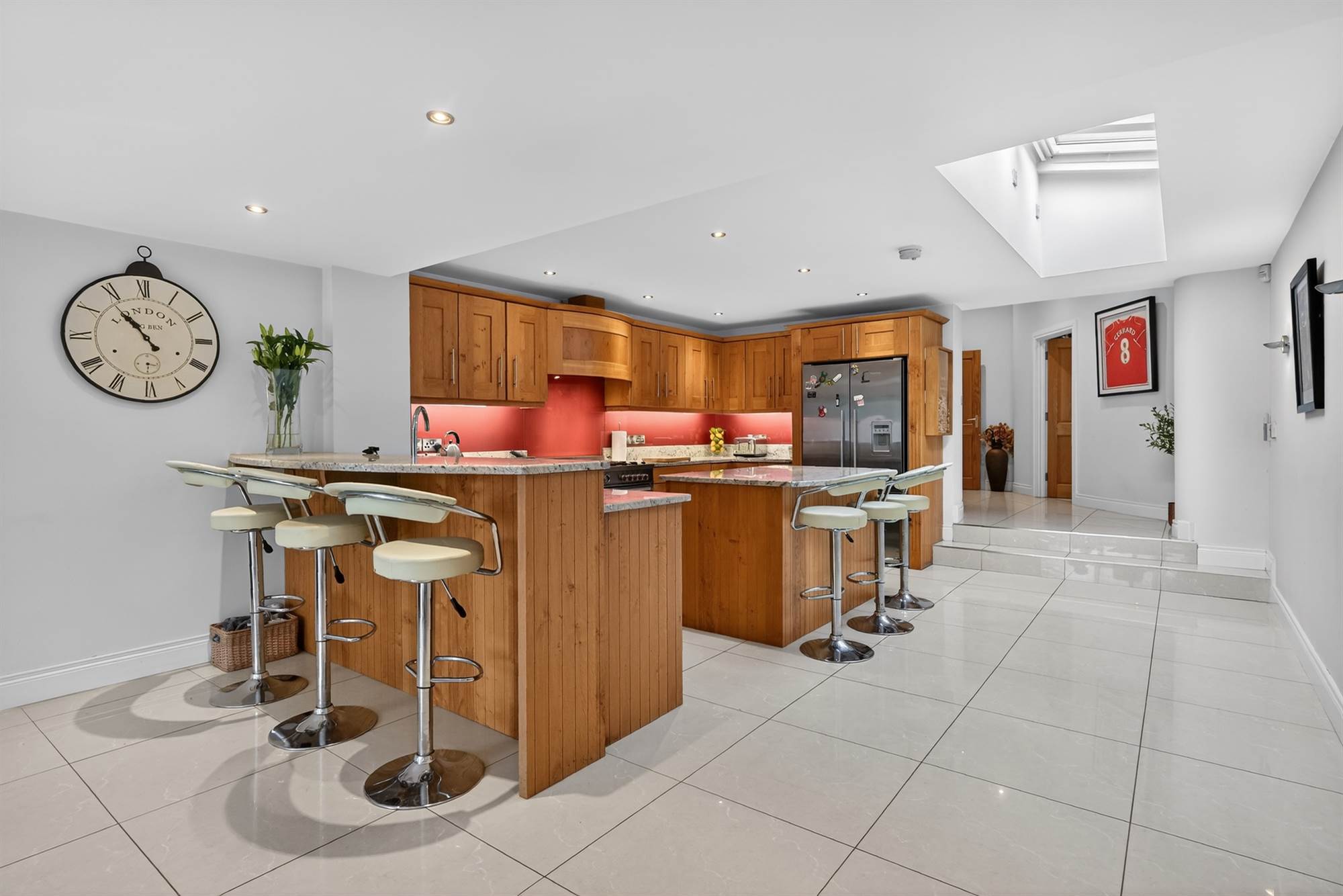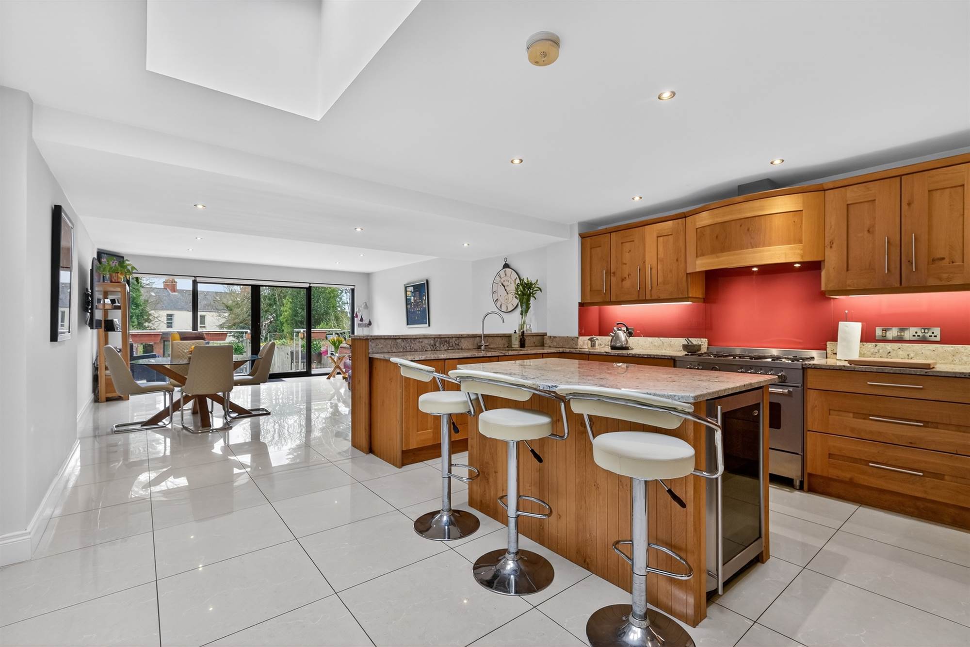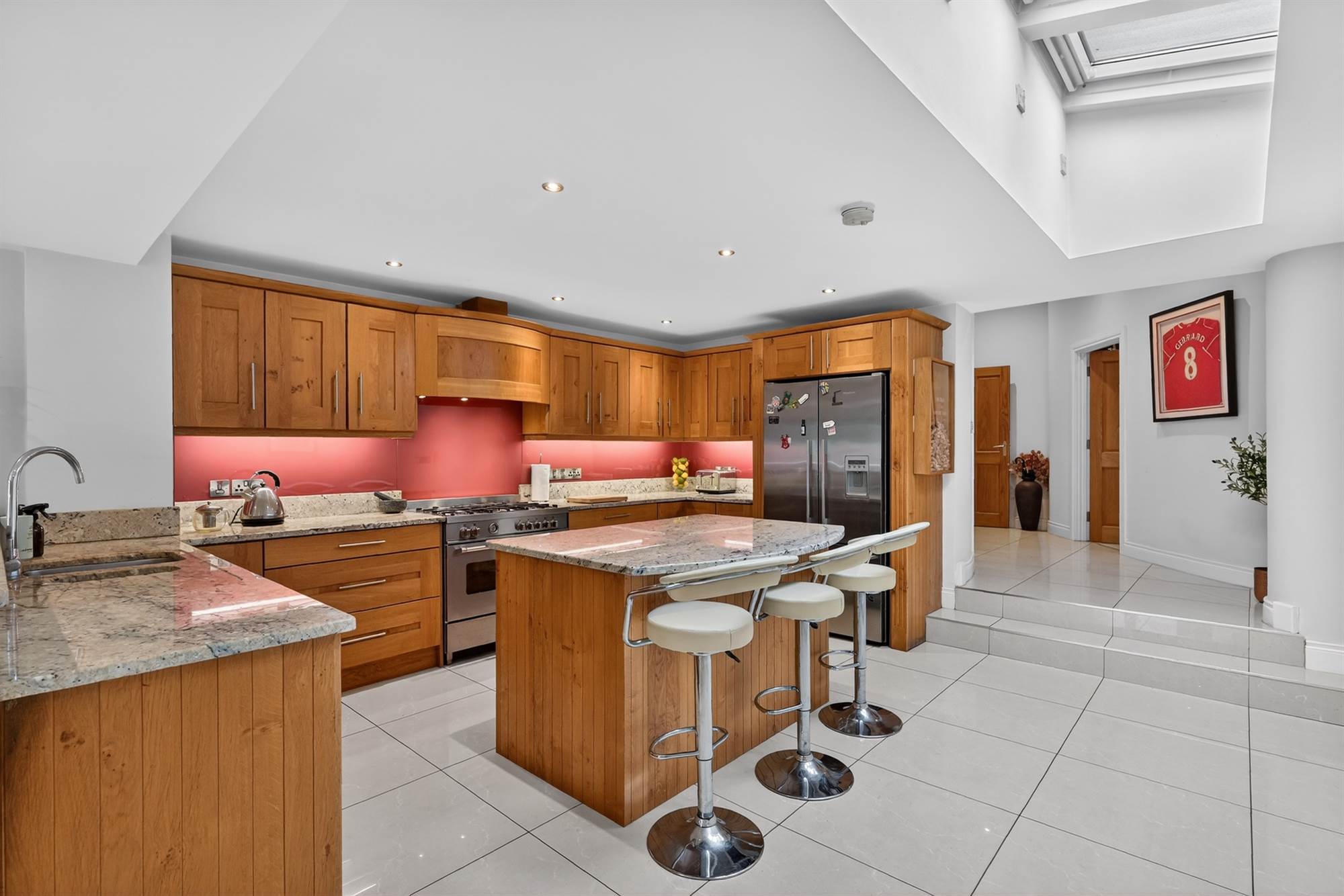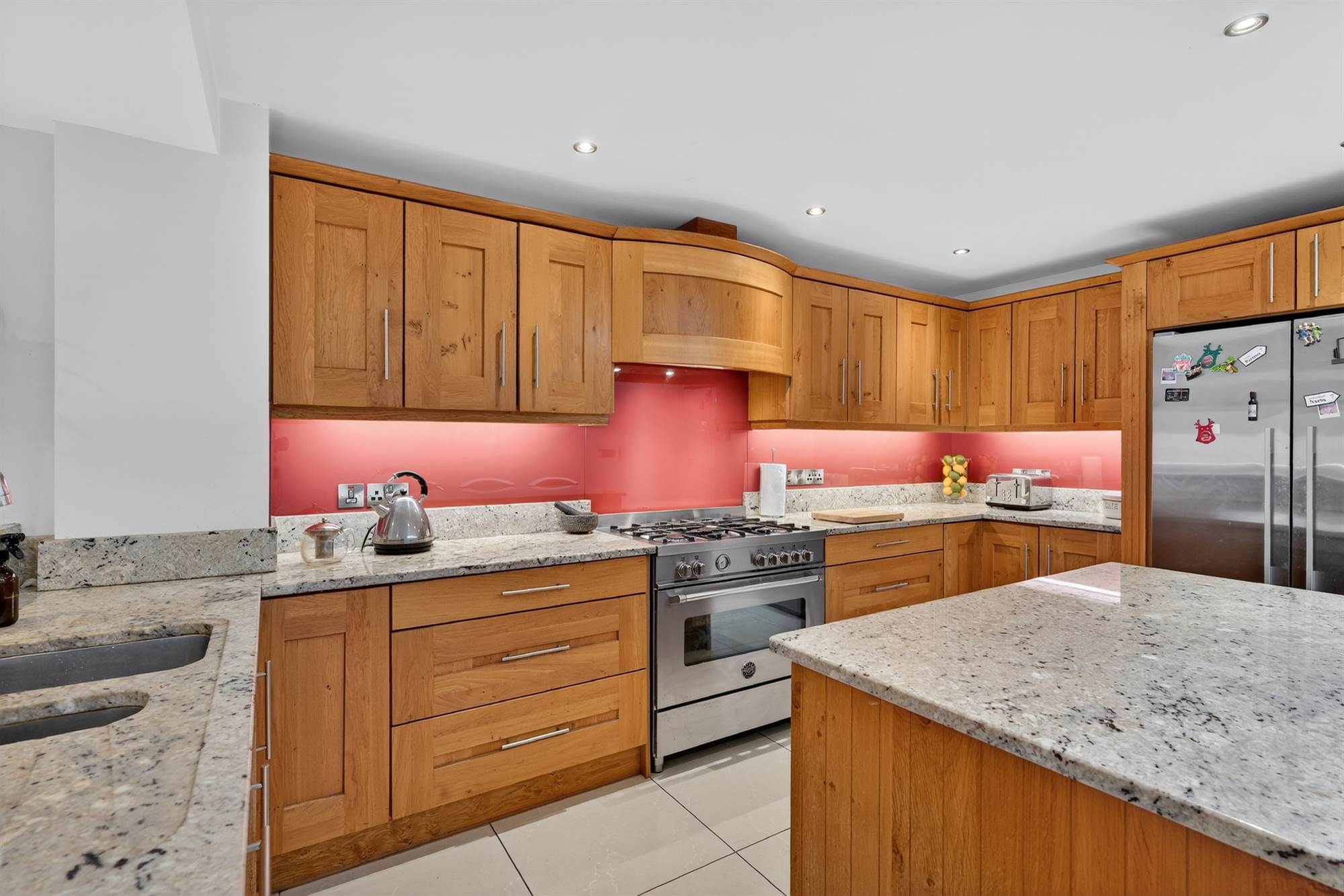 Besoke fitted kitchen with extensive range of high and low level oak units with matching island, granite worktops and upstands, stainless steel 1.5 bowl sink with drainer and mixer tap, Bertazzoni range cooker, five ring gas burner, electric oven and extractor fan, Fischer and Paykel American style fridge freezer, integrated dishwasher, ceramic tiled floor, additional raised bar/seating area with granite worktop, powder coated aluminium frame double glazed doors to exterior, three electronic rain sensor Velux windows.