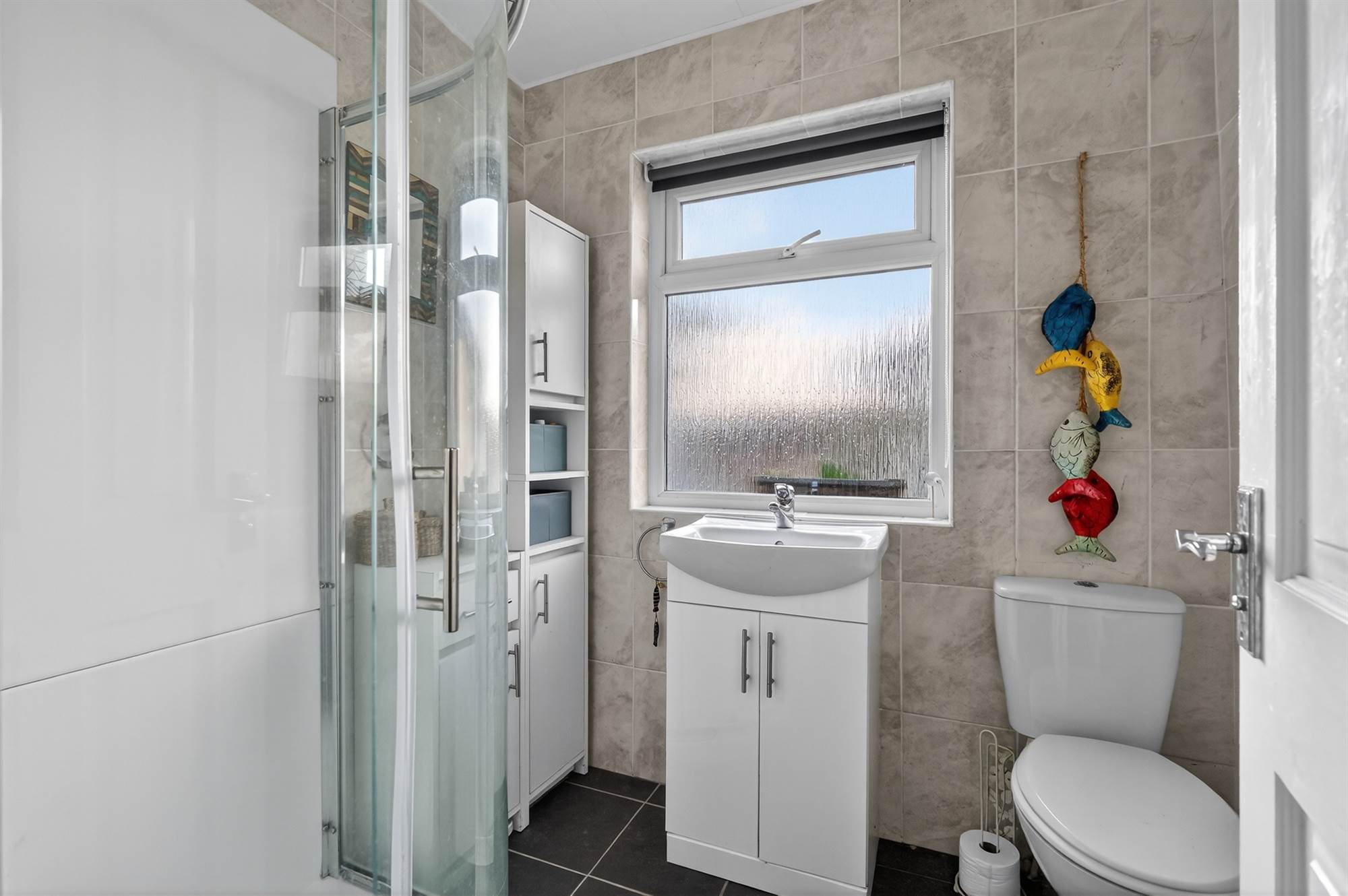 Fully tiled built in shower cubicle with mains shower unit, low flush WC, wash hand basin with mixer taps, fully tiled walls, ceramic tiled floor, window.