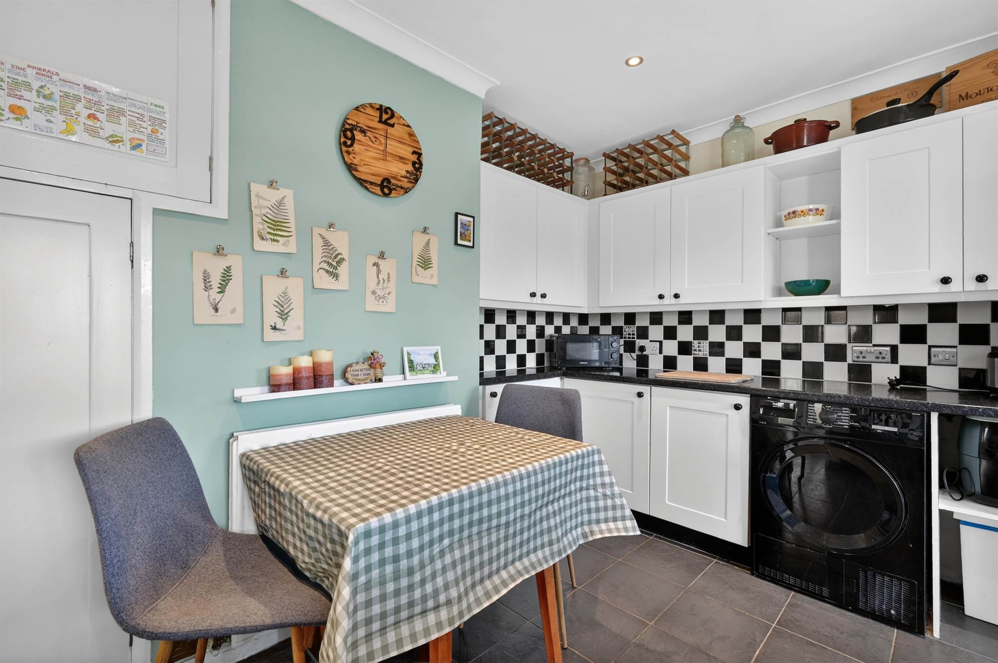 Shaker style kitchen with range of high and low level units, stainless steel sink with drainer and mixer tap, laminate worktops, built in 4 ring hob with extractor fan, cooker, plumbed for washing machine, space for dryer, part tiled walls, ceramic tiled floor, door to...