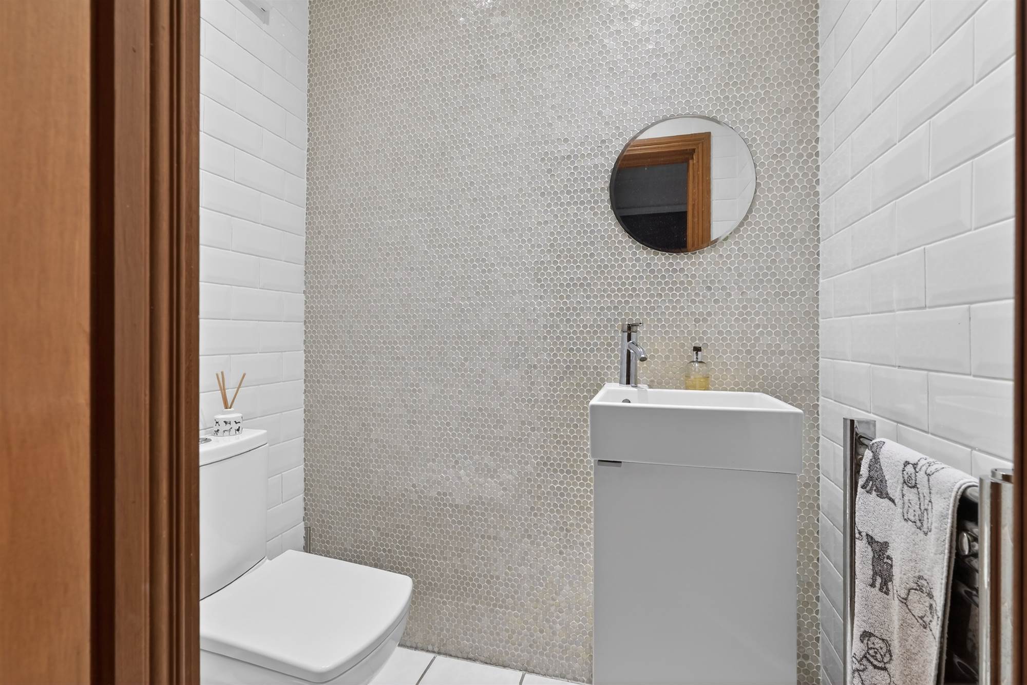 Comprising low flush wc, wash hand basin, fully tiled walls.