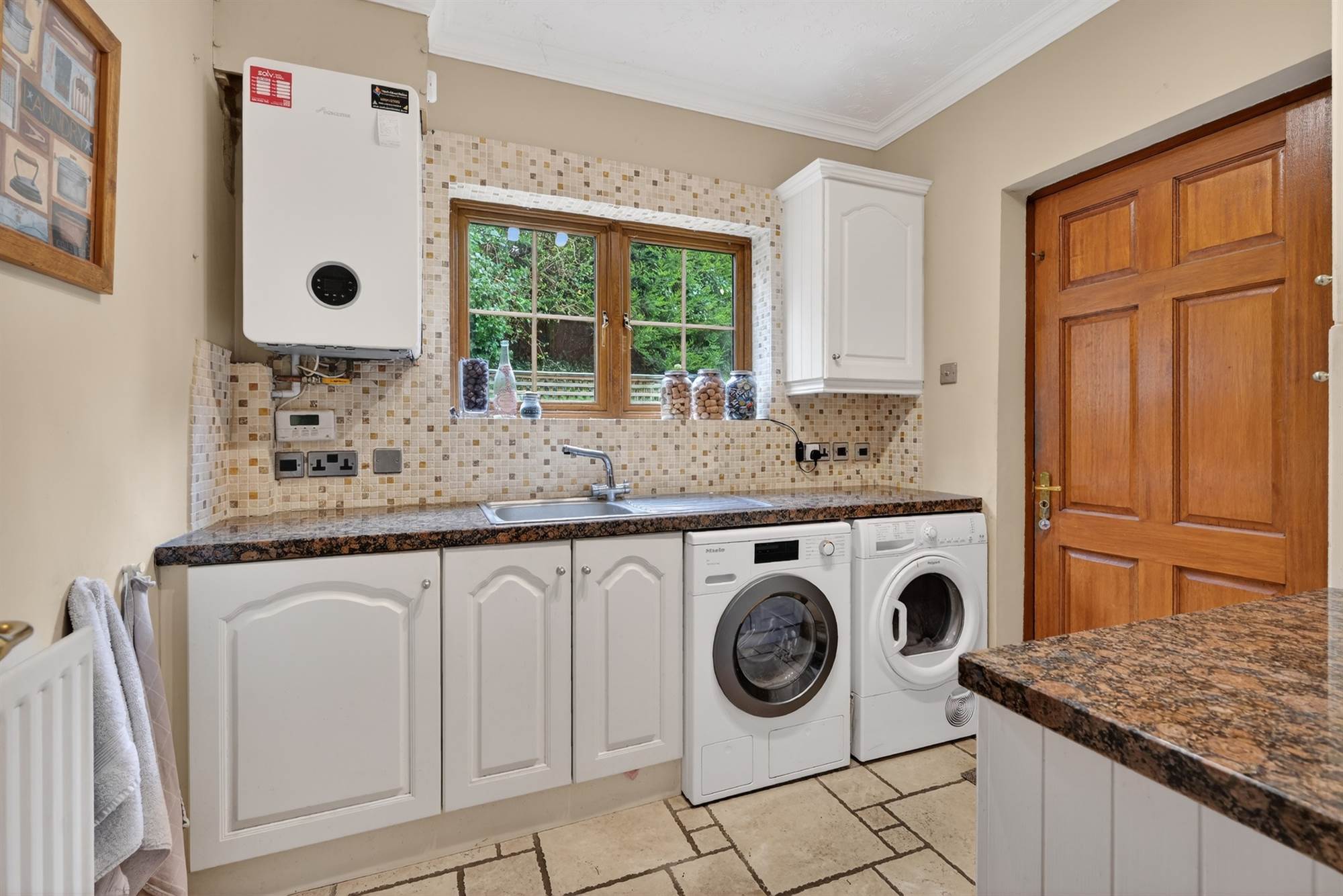 Range of high and low level units with granite worktops, single drainer stainless steel sink unit, plumbed for washing machine and tumble dryer, ceramic tiled floor, part tiled walls.