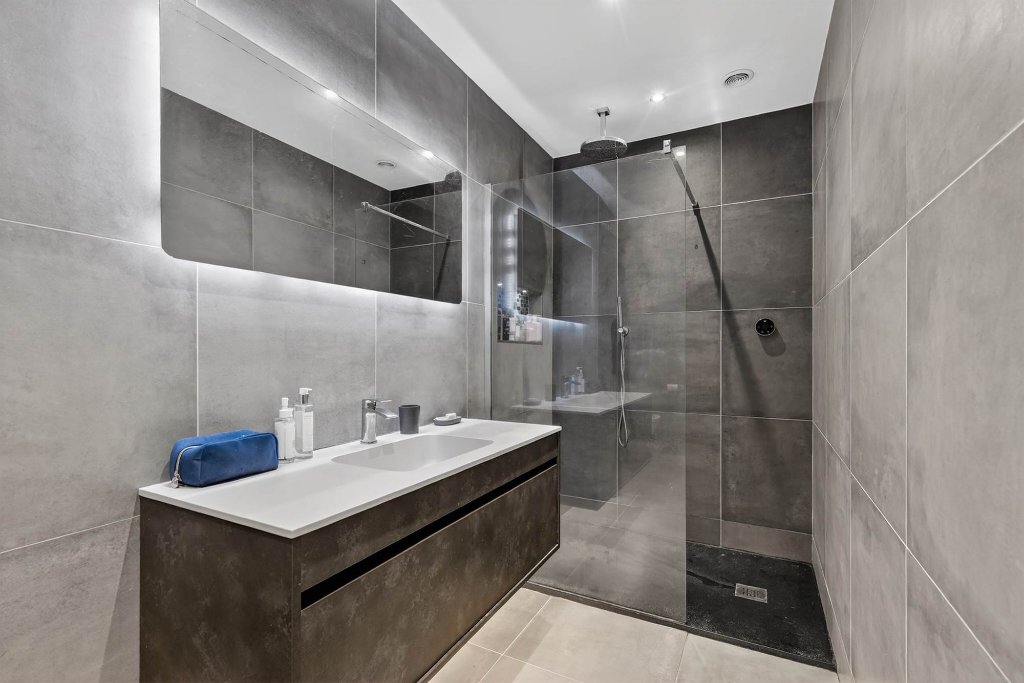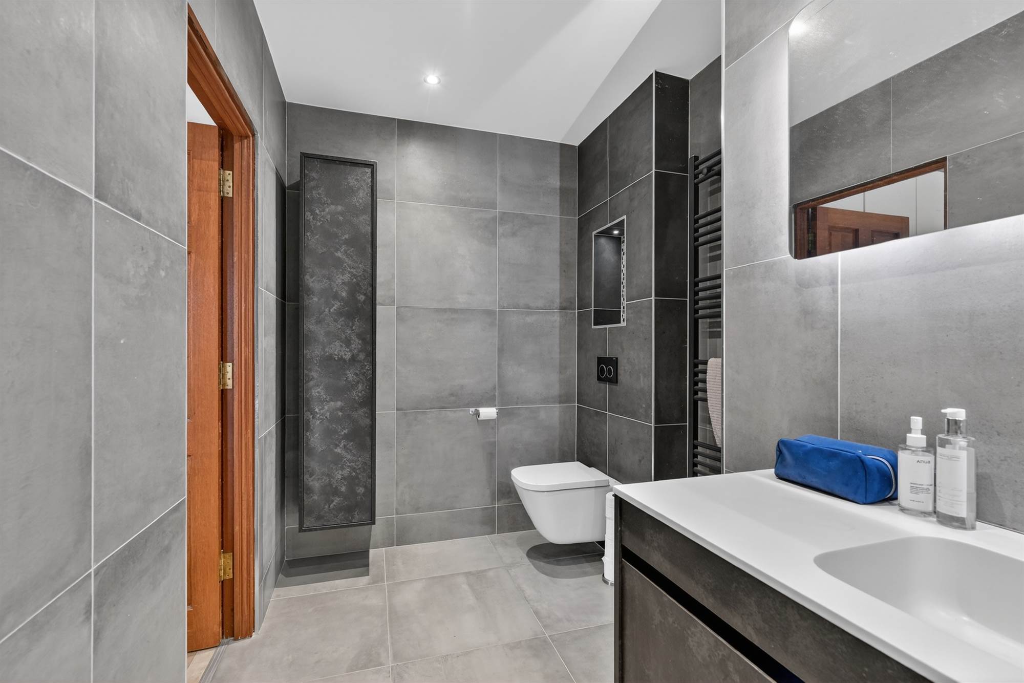 Fully tiled walk-in shower cubicle with overhead shower and body jets, vanity unit with mixer tap, low flush wc, heated towel rail, ceramic tiled floor, fully tiled walls.