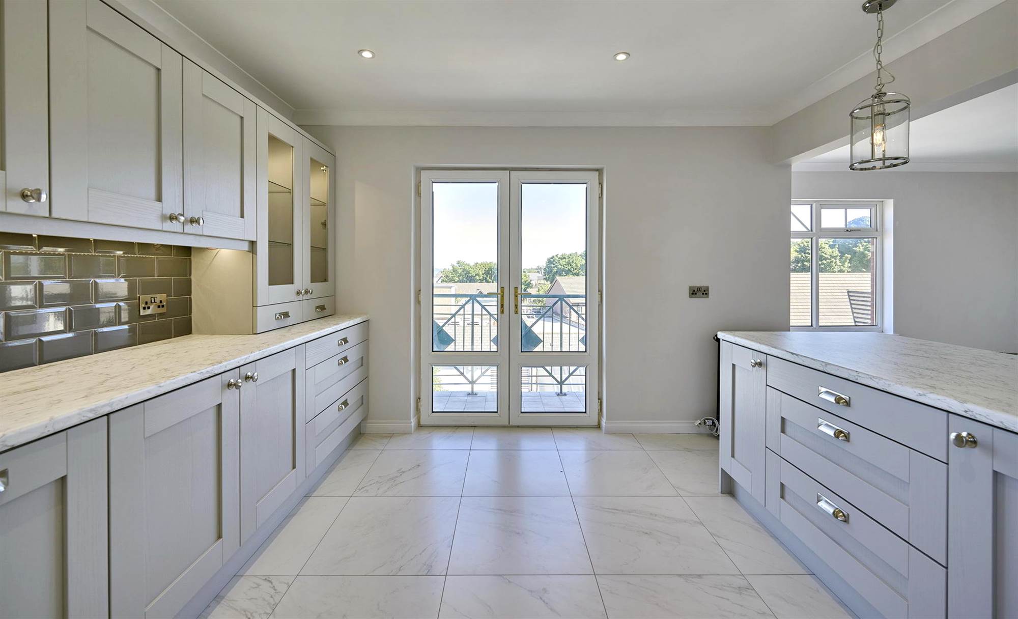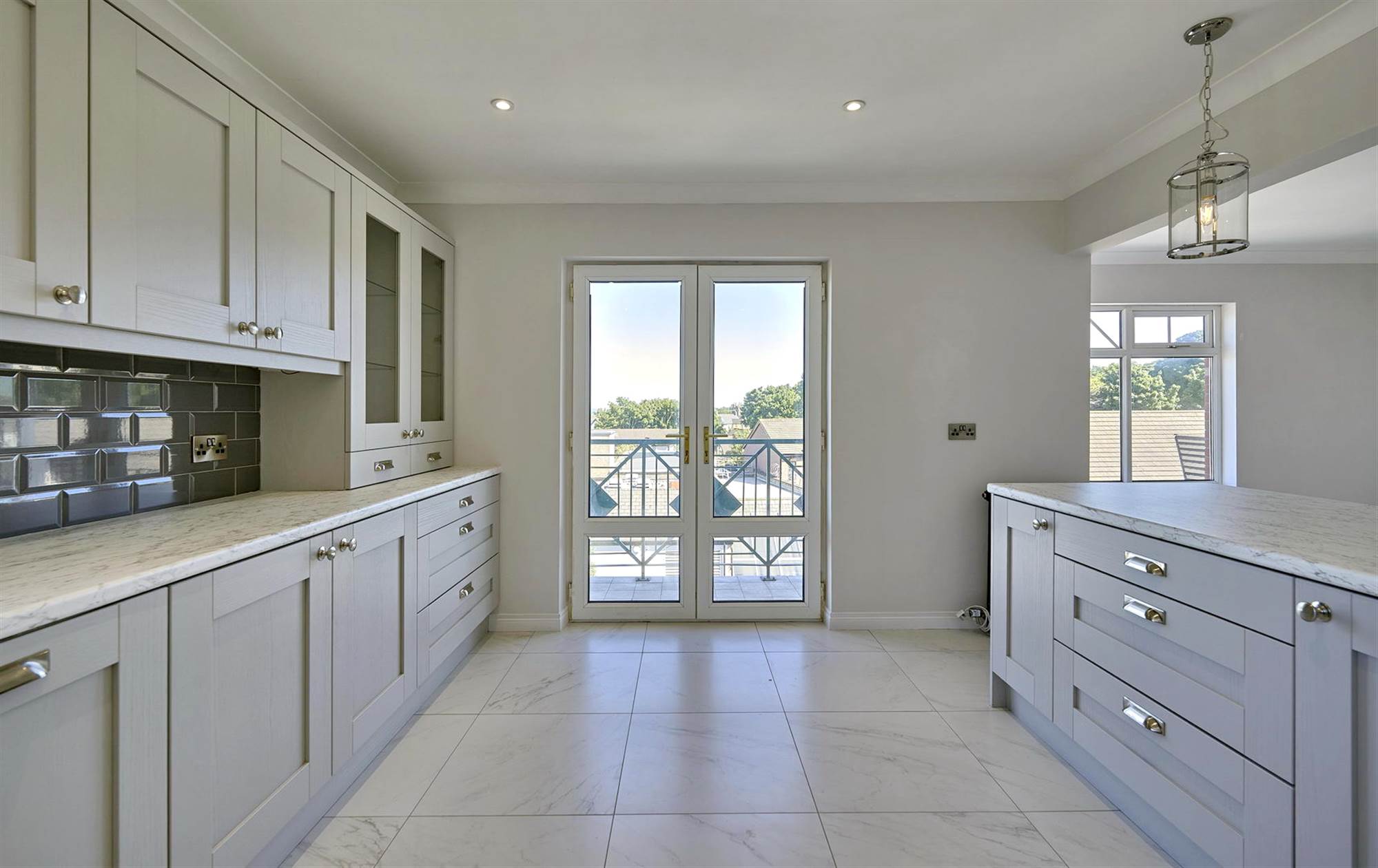 Modern Fitted kitchen with excellent range of high and low level units, space for fridge freezer, electric oven with extractor hood, access to balcony with panoramic views.