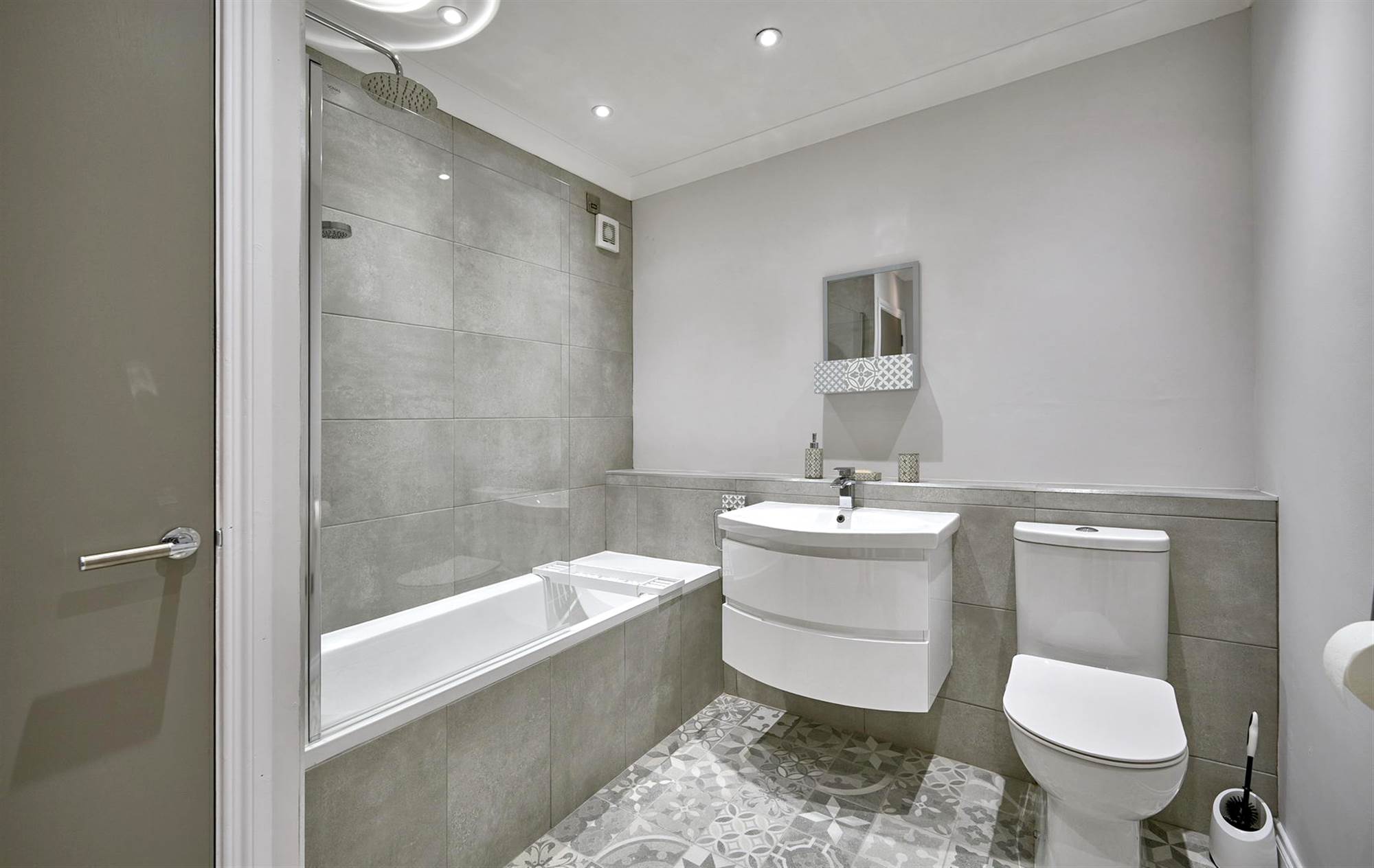Modern fitted bathroom with vanity sink unit, W/C, Bath with rainfall shower and shower screen.