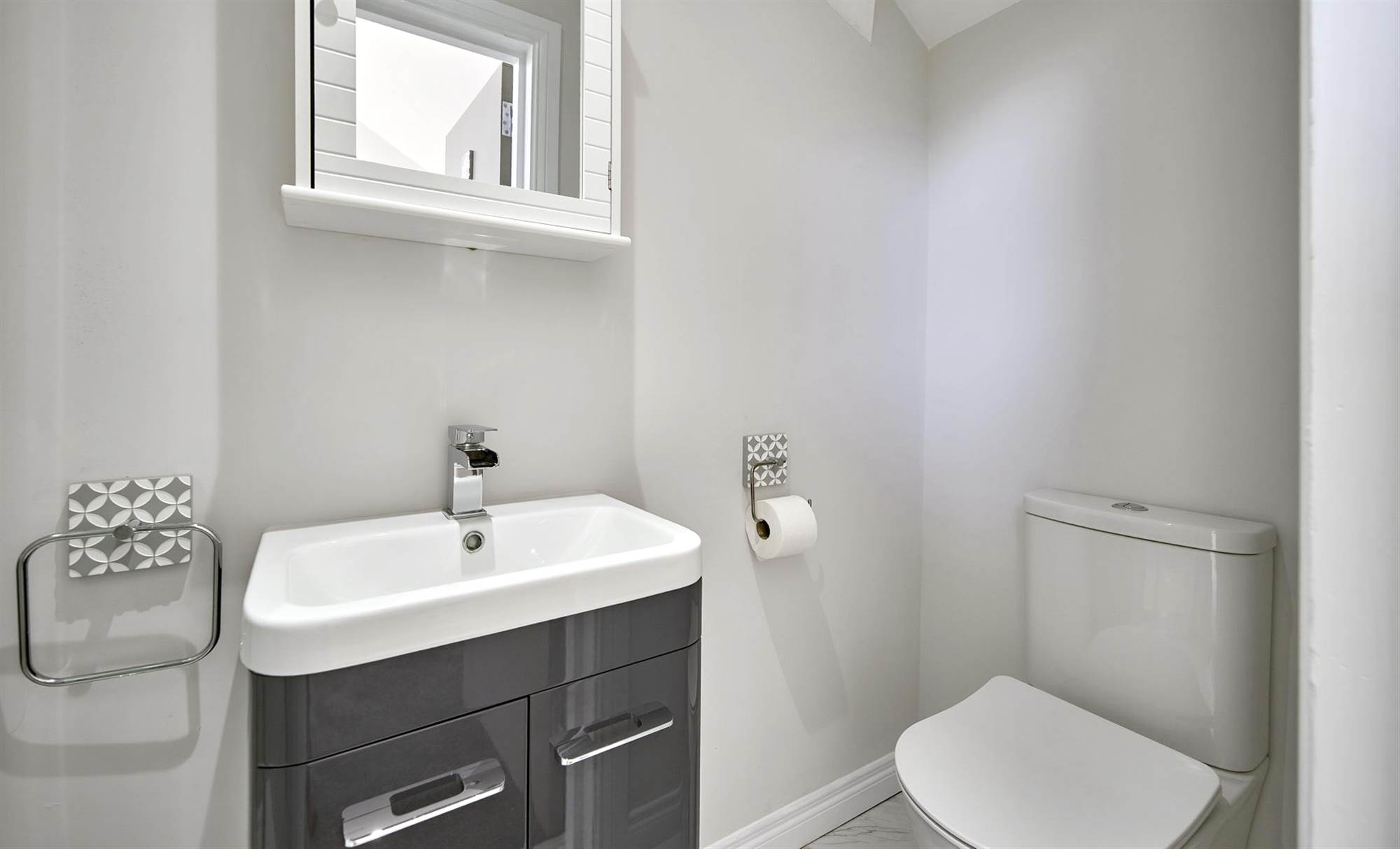 Built-in tiled Bathroom and floor. Vanity unit , low flush wc, extractor fan.
