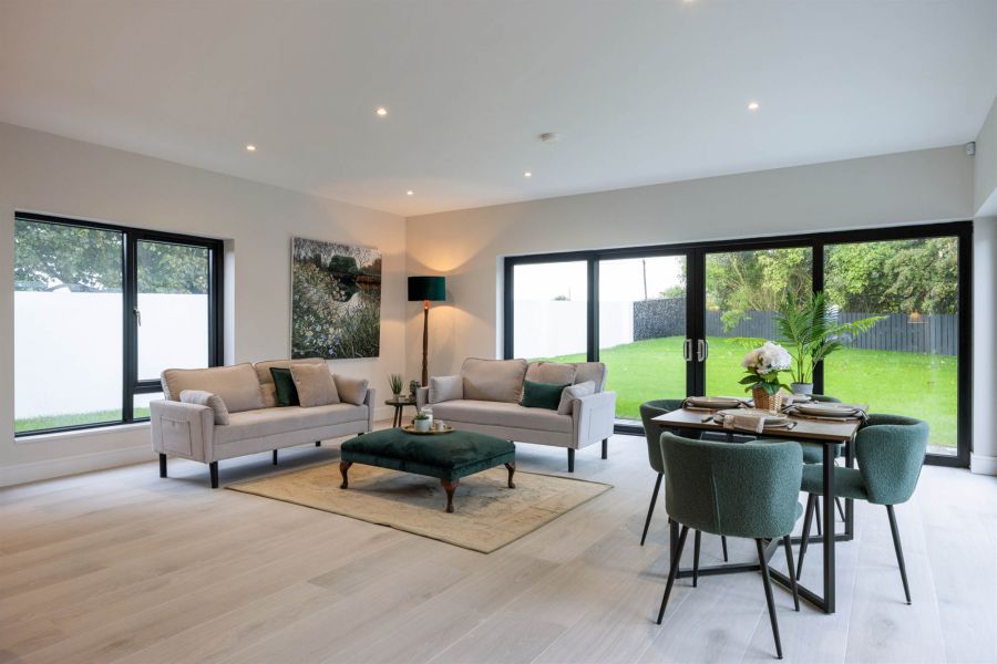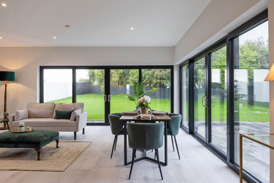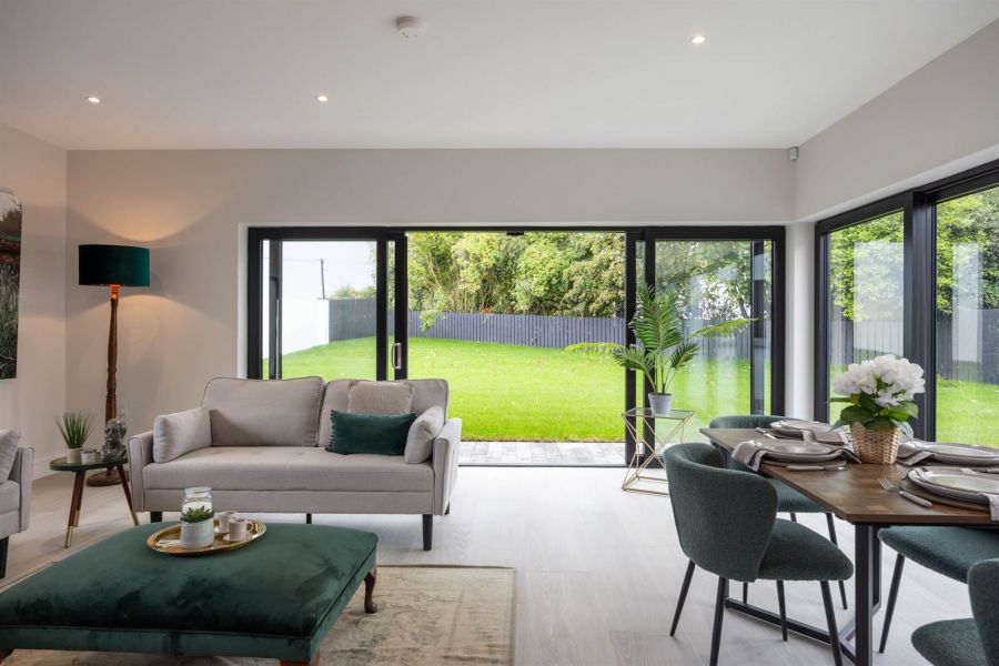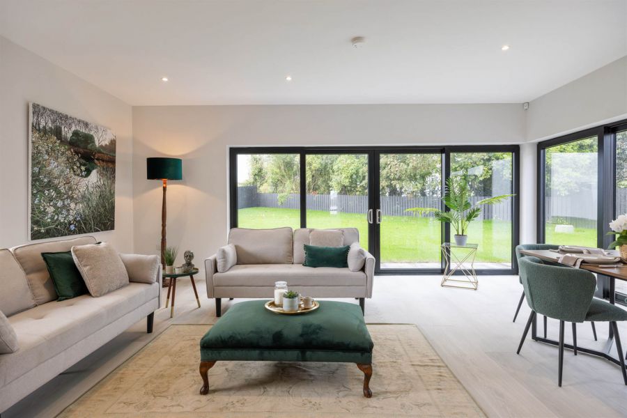 Bright open plan kitchen/living/dining space with sliding doors to the garden