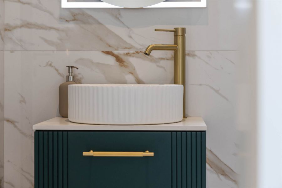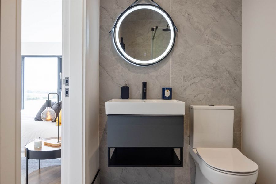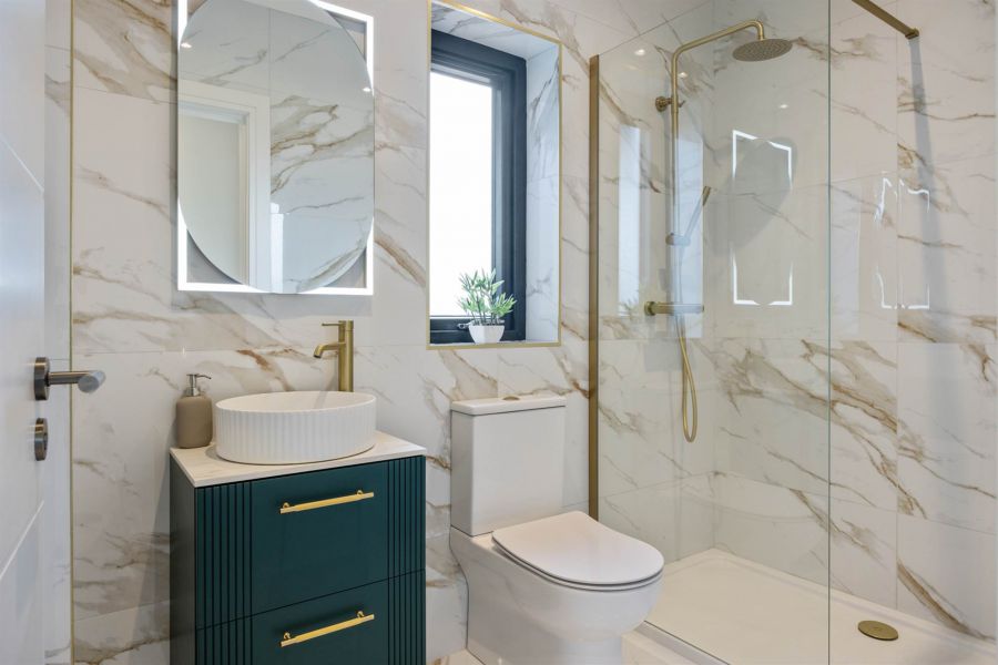 High-end bathroom finishes throughout, including fitted vanity units and mirrors