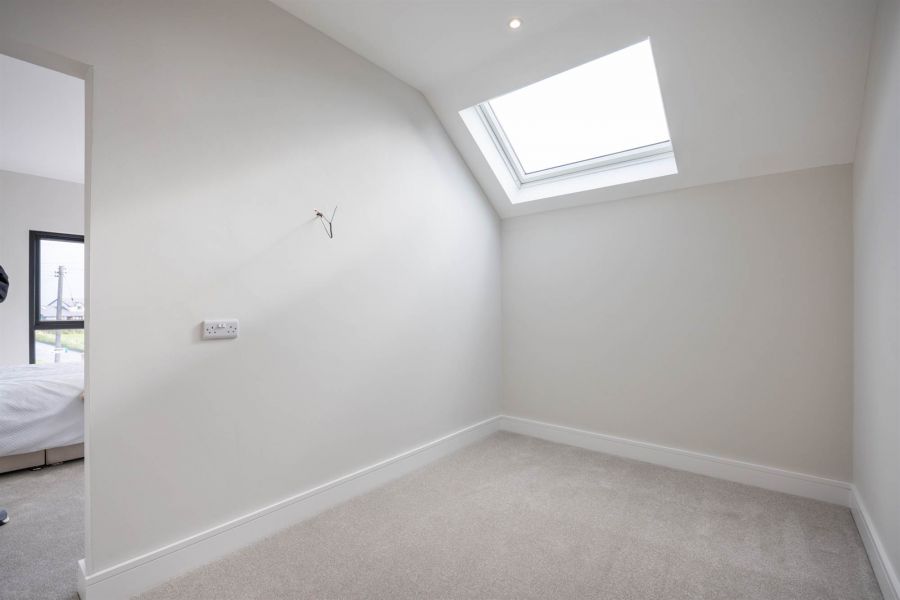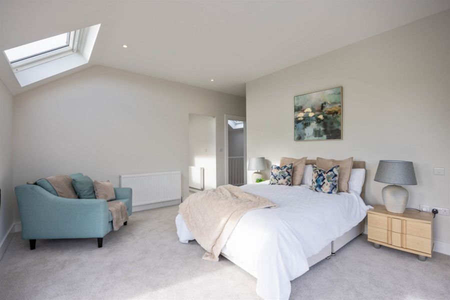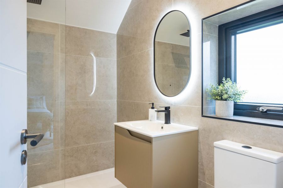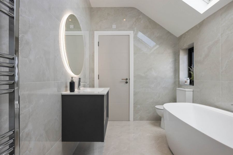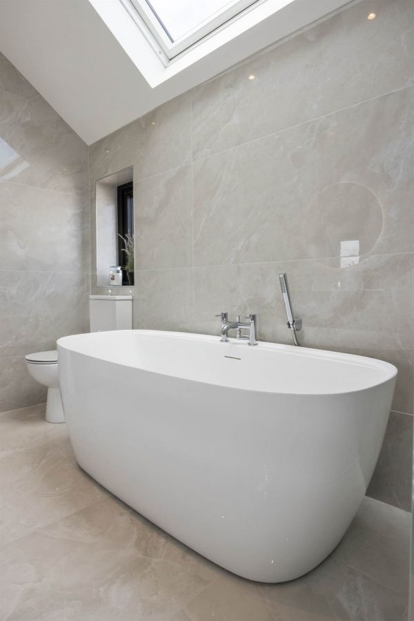 Fully tiled luxury suite comprising freestanding bath, walk in shower, low flush wc, vanity unit with mixer tap. Skylight.