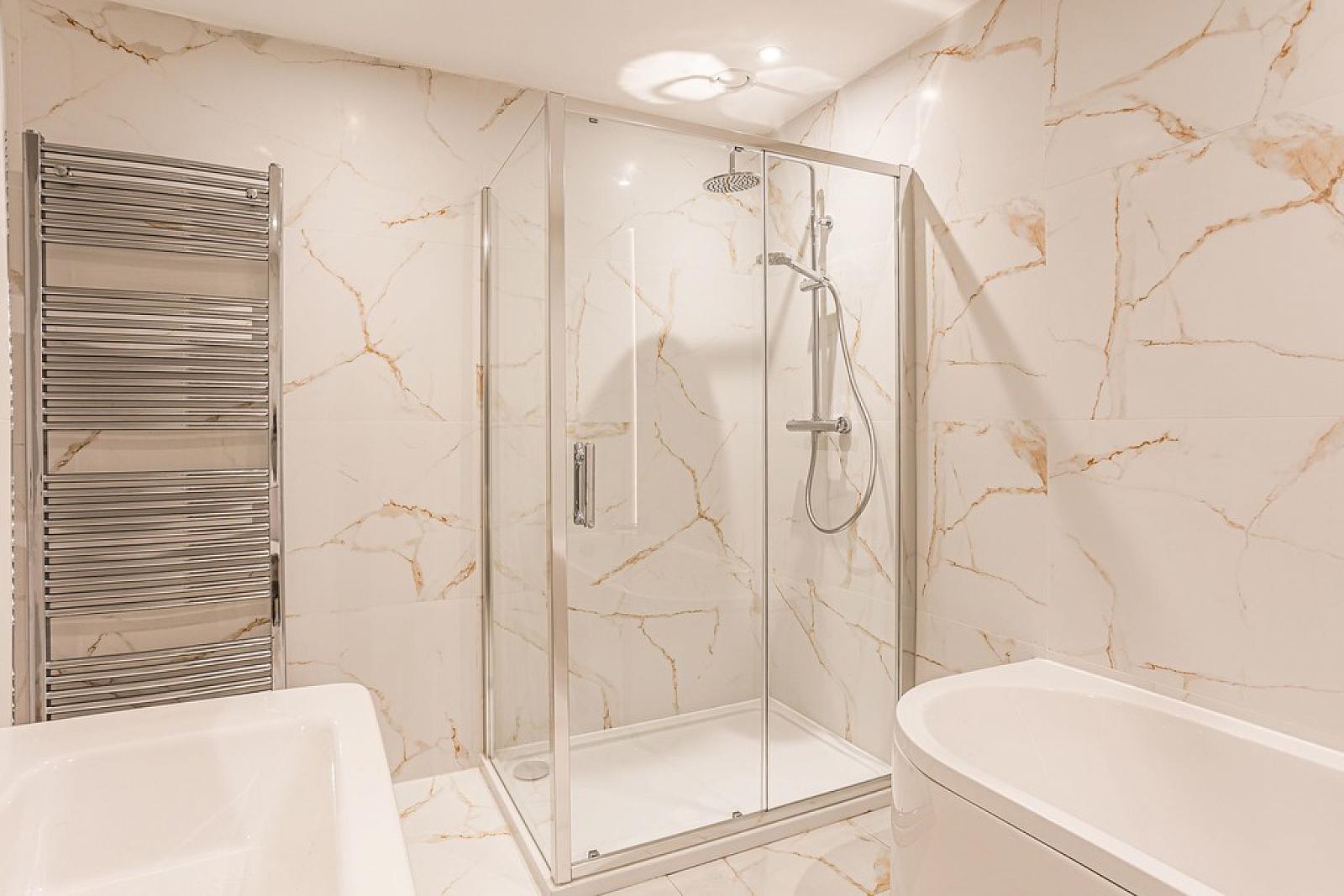 Generous Tiled Bathrooms With Luxury Suite & Built In Vanity Units