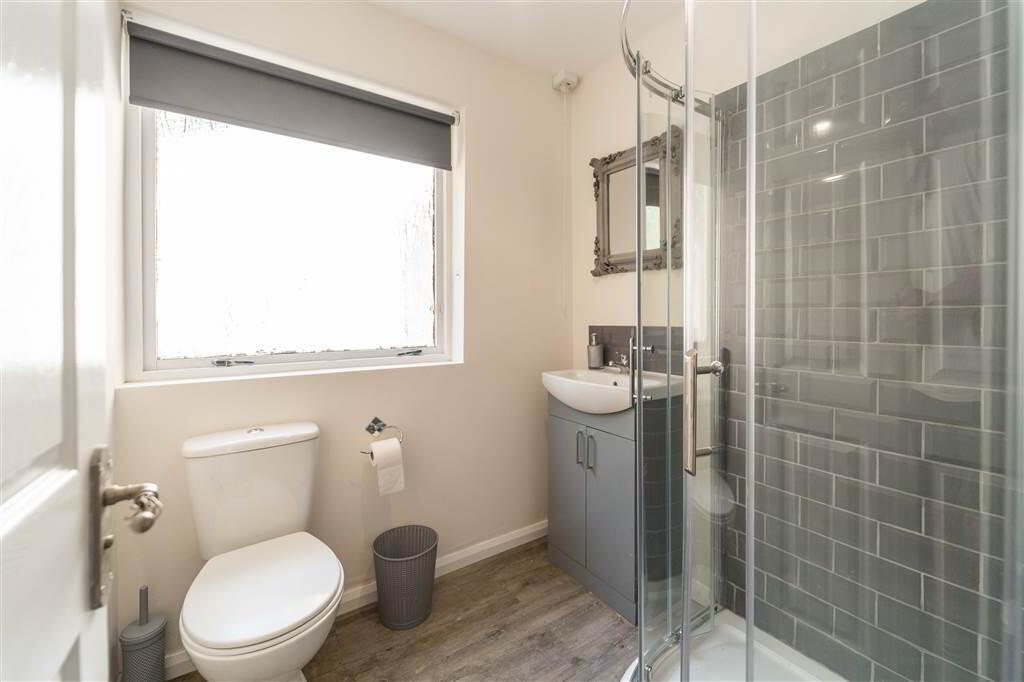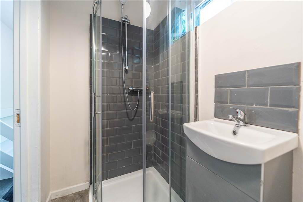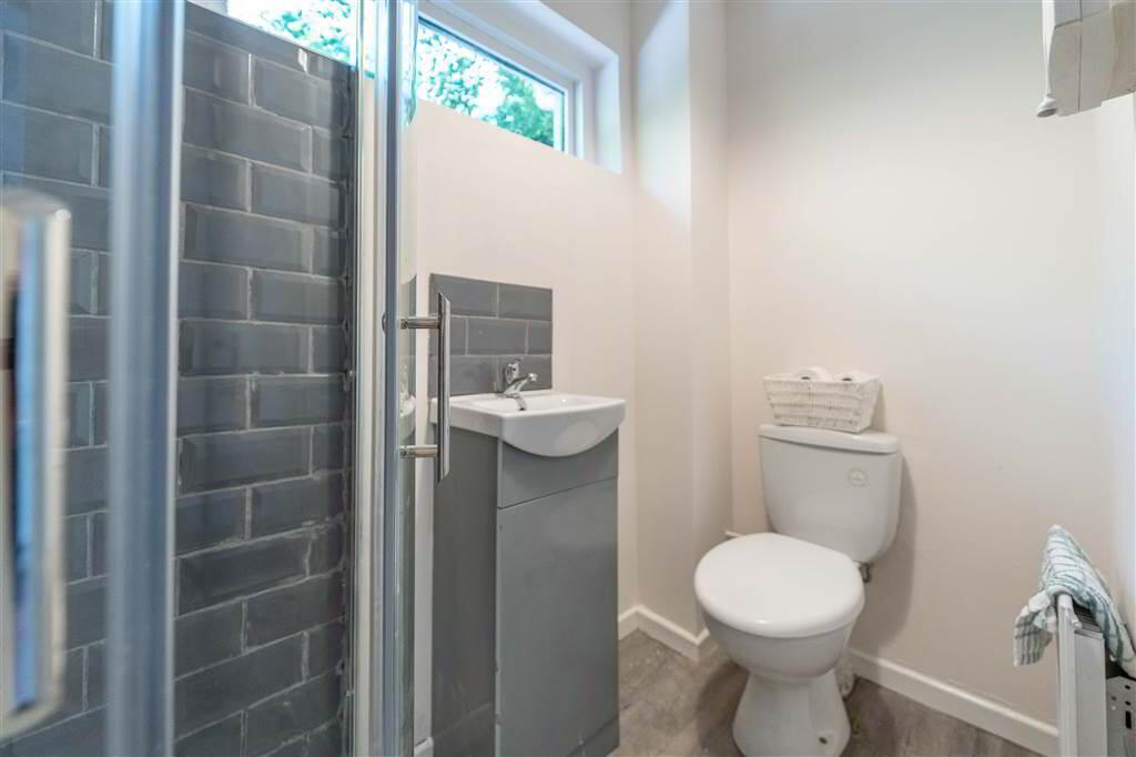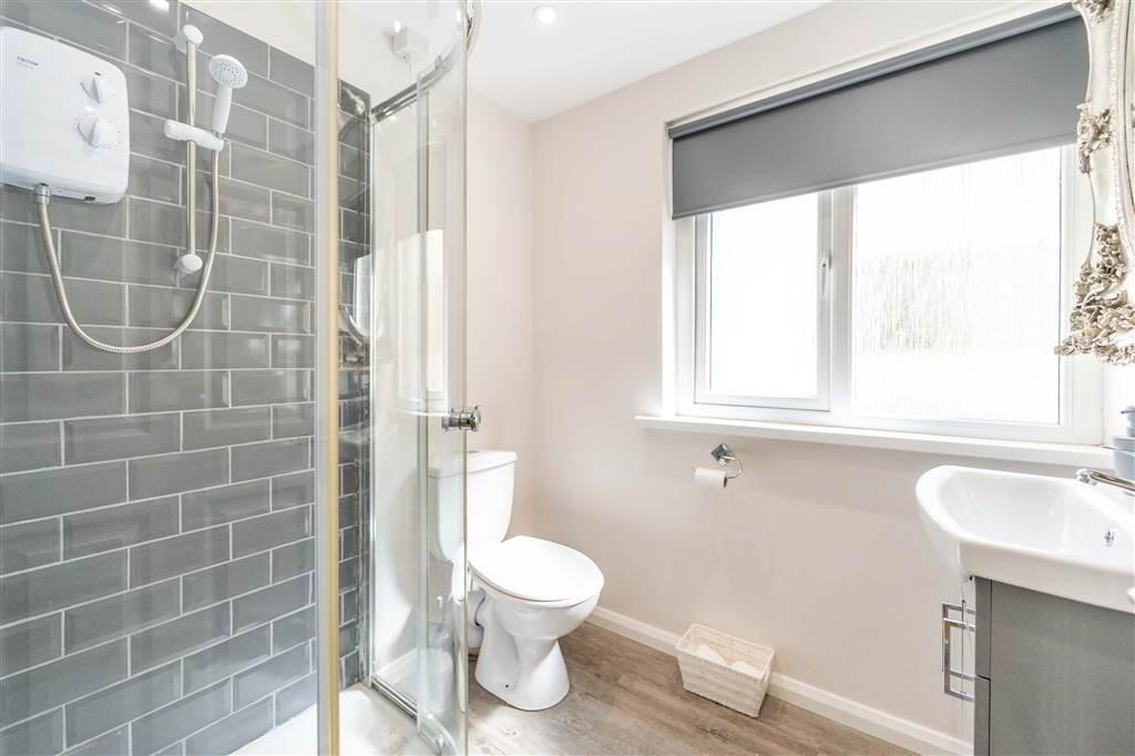 - 1.85m x 1.75m (6' 1" x 5' 9")Three-piece Suite comprising a Low Flush W.C., a Sink with Tiled Splash back and Storage under and an Electric Corner Shower. Complete with Laminate Wooden Flooring, part Tiled Walls and an Extractor Fan.