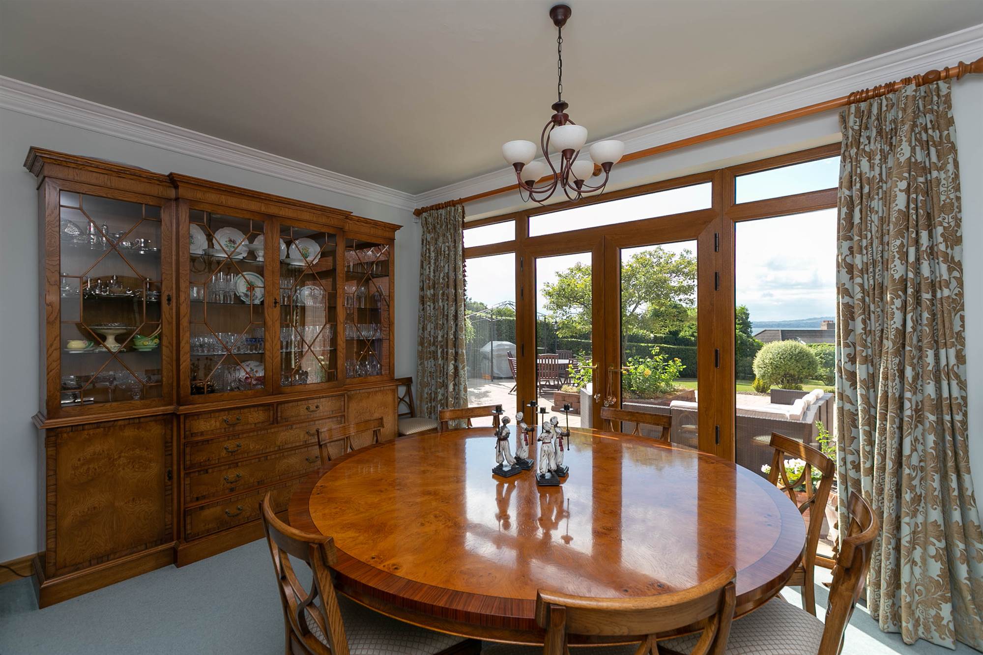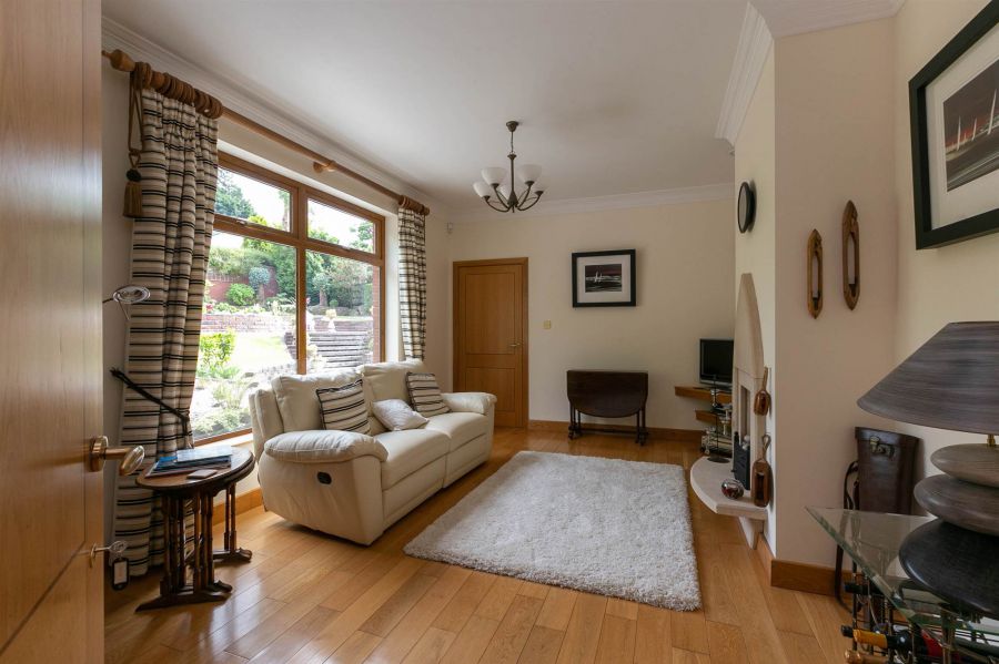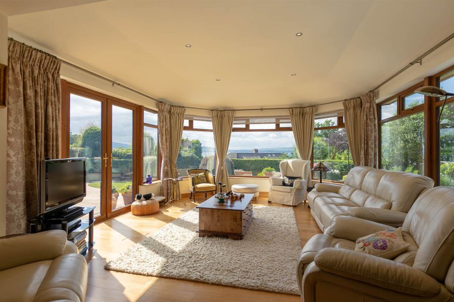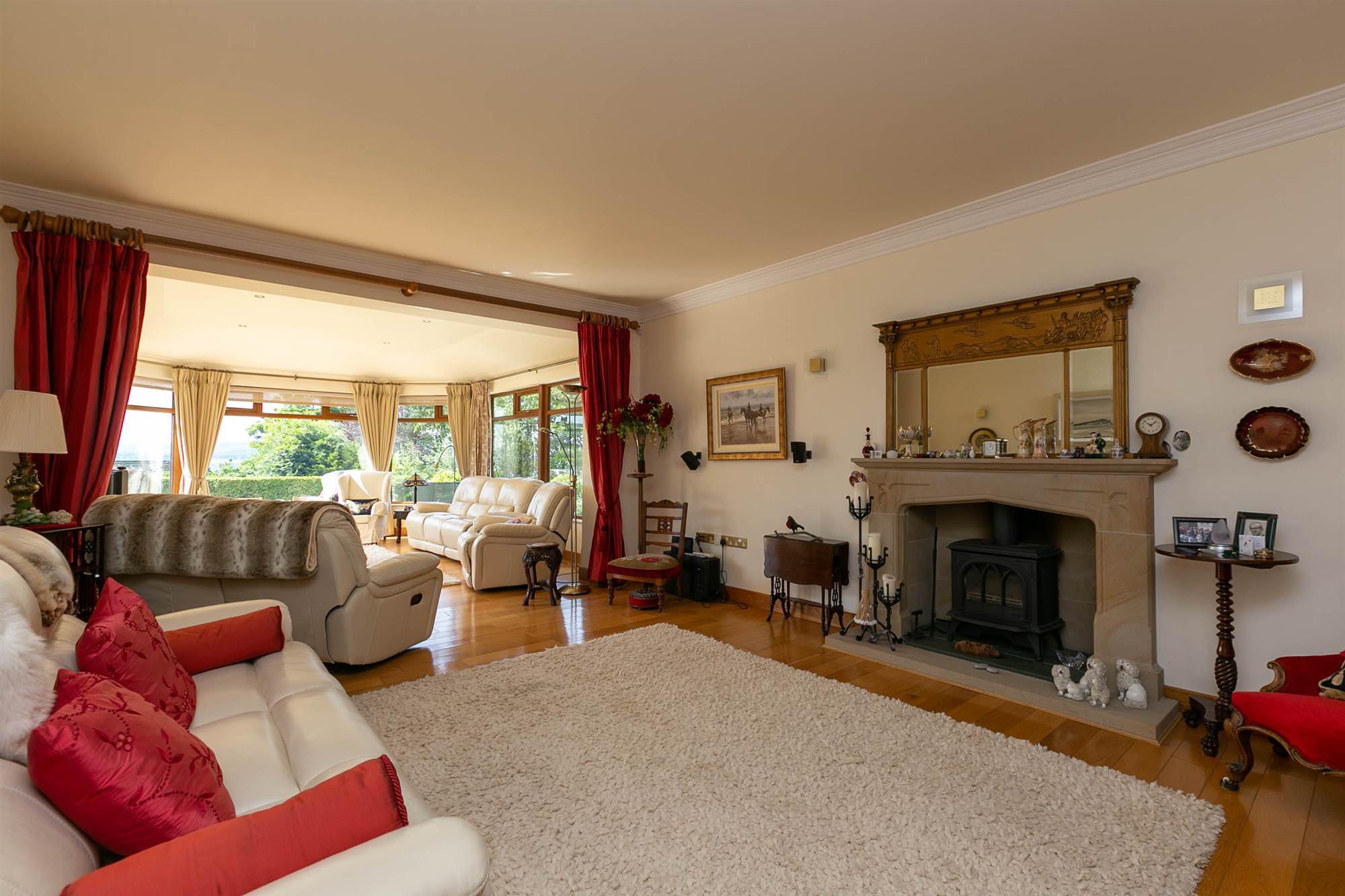 Solid wooden floor, glazed walls and double opening French glazed doors to patios and gardens, all with panoramic Belfast Lough views over towards the County Antrim hills.