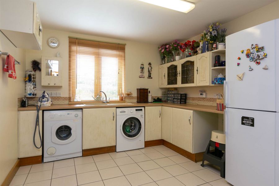 Tiled floor, high and low level fitted cupboards, drawers, shelves and units. Single drainer sink unit, space for washing machine and dryer, ironing and drying space, additional freezer storage and wine cellar