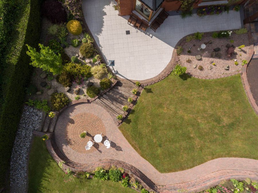 Raised and lower sun terraces with granite patios leading to the side of the house in front of flower beds.