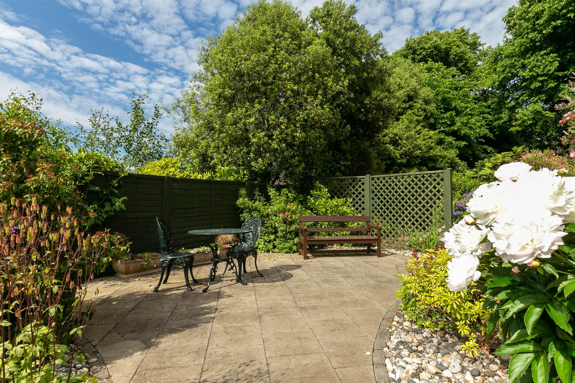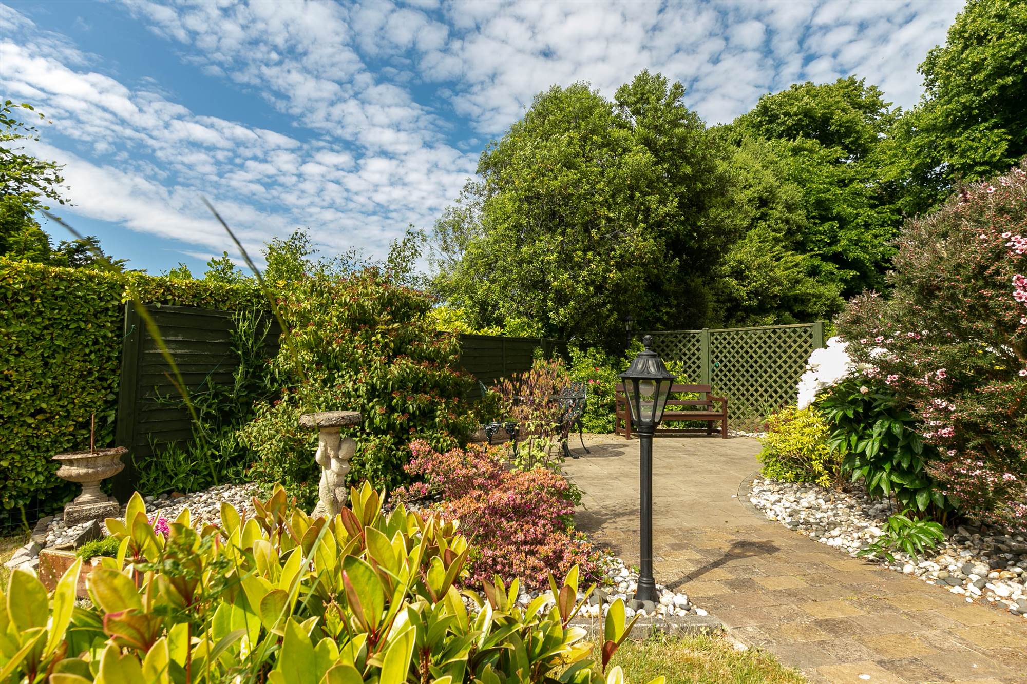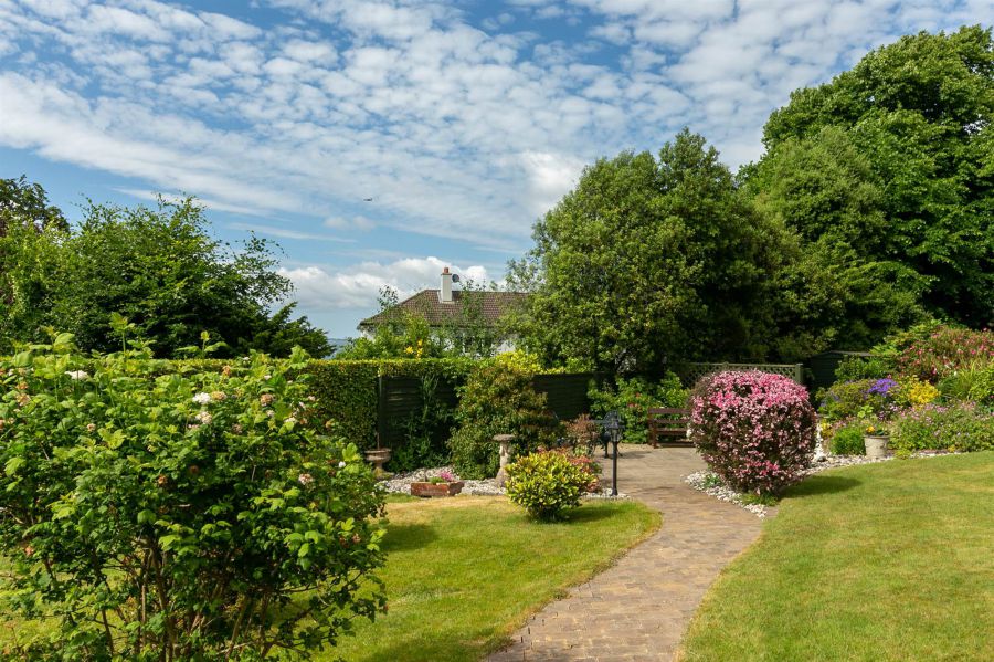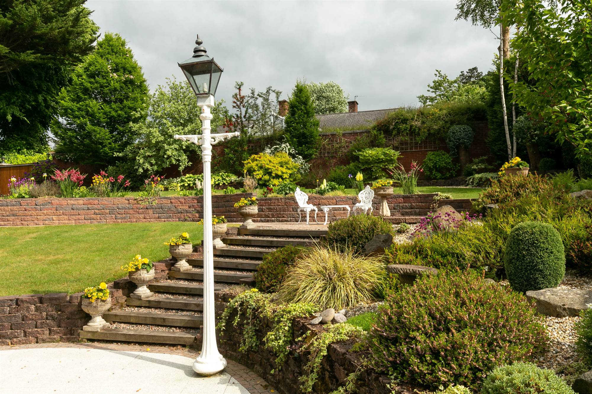 Lawns bordered by mature hedges, lower patio area, ideal for evening and morning sun, side terrace, patio access from triple garage with outside power supply, additional water supply, access to front of the property. Pathway to mature tree and potting area with compost area to the side. Shed with gardener"s WC.