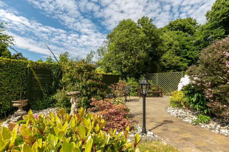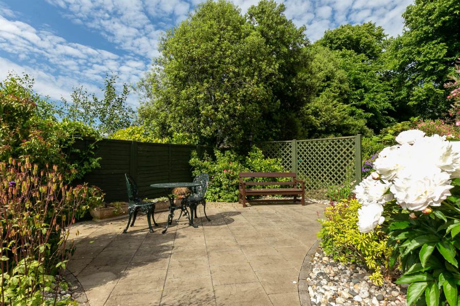 To the side of the property - specimen trees, plants, colourful flowerbeds, outside water supply, outside power, subtly lit specimen trees, BBQ area, central specimen tree in patio area, which is accessed from the dining room, sun room and kitchen with a southwest facing aspect with all afternoon and evening sun.