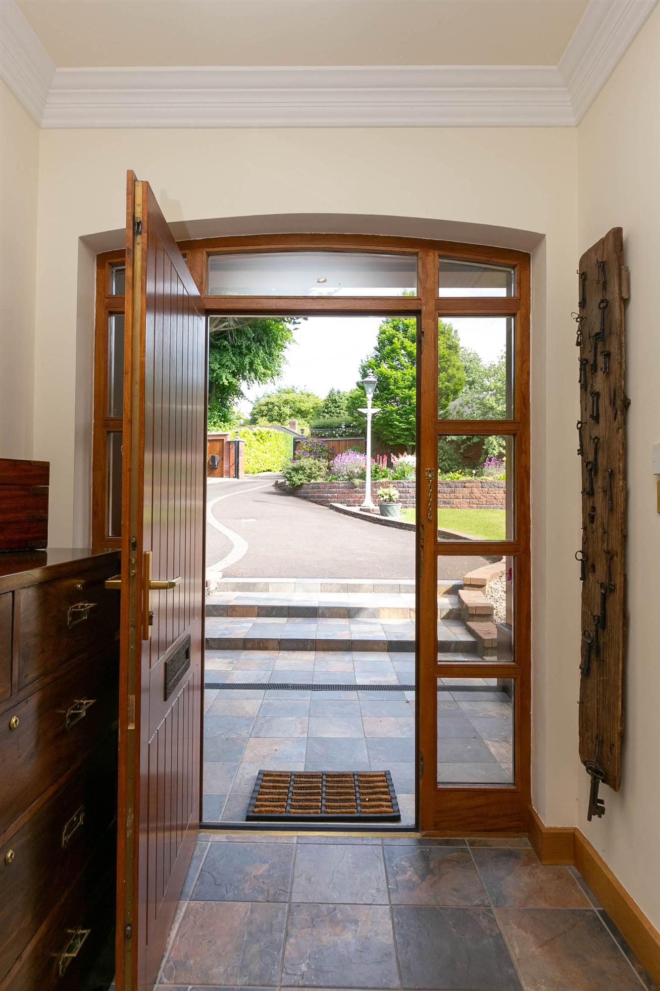 Tiled covered entrance porch leading to hardwood front door with glass panels and fan light.
