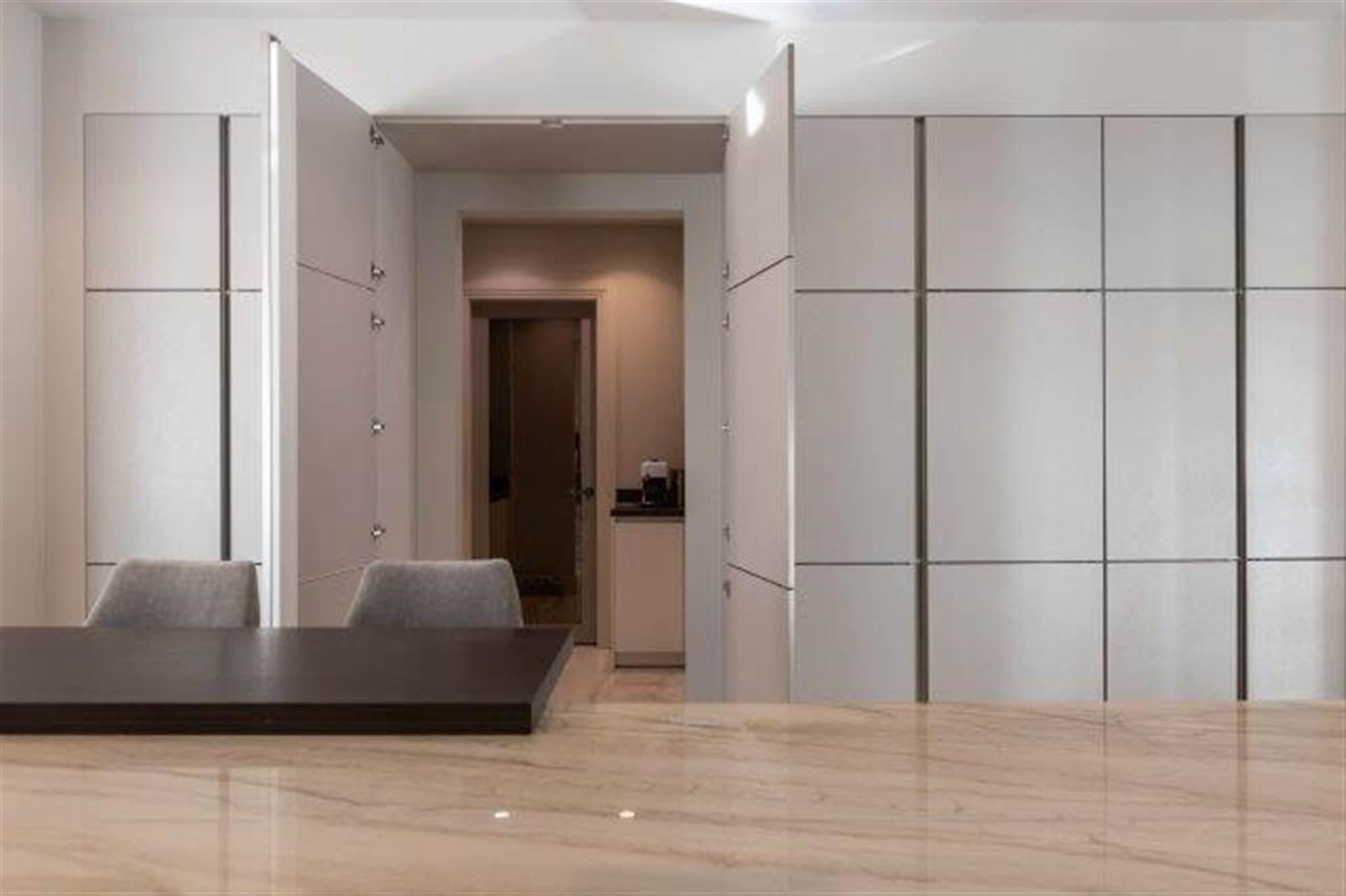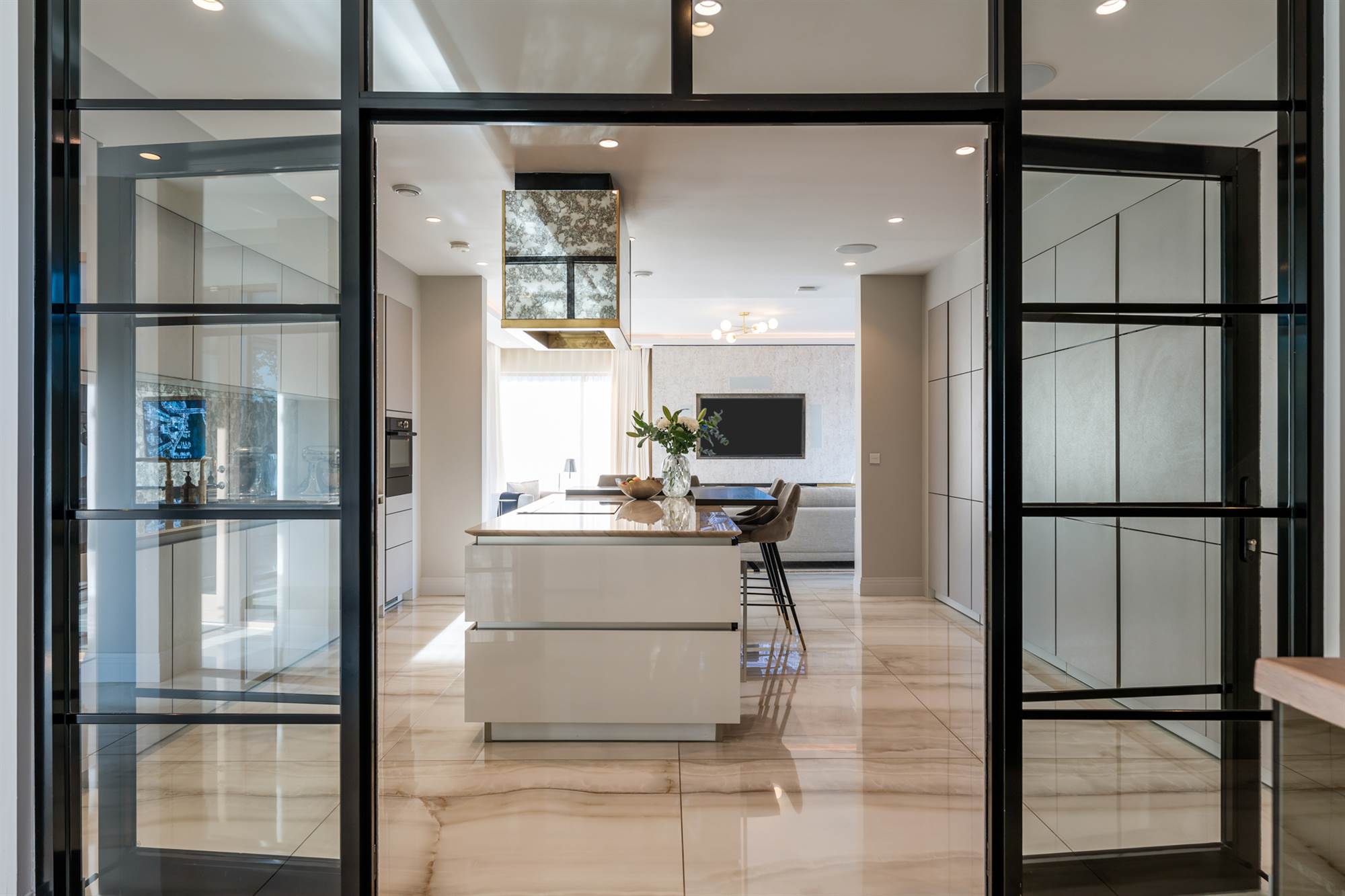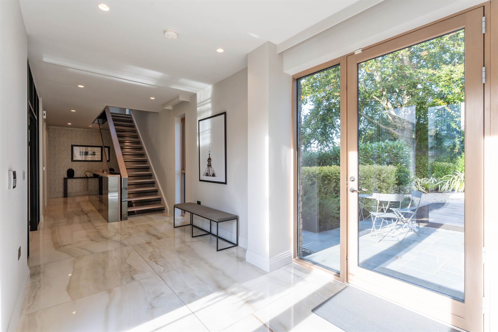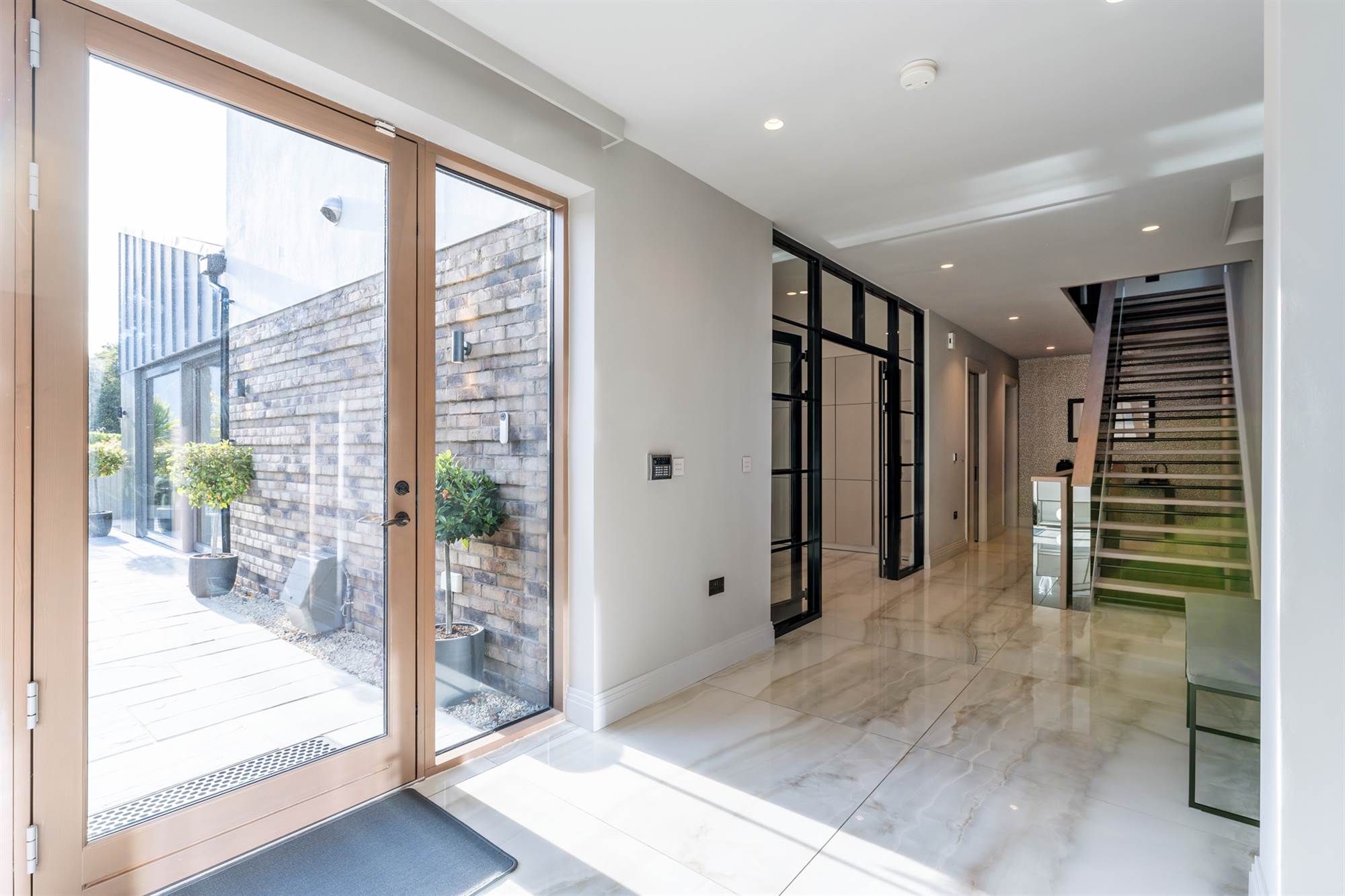 Glazed door and side panels to rear parking, turning and garden areas. Beautiful solid marble tiled floor, detailed lighting, stairs down to lower ground floor and stairs up to first floor. Glazed Crittall wall with leading to: