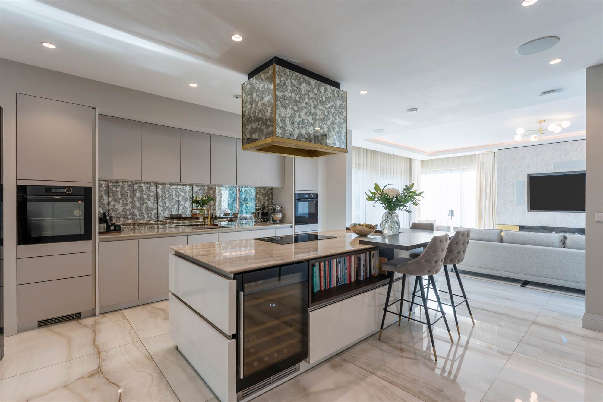 Solid marble tiled floor with island unit with Italian marble worktops and fitted De Dietrich ceramic hob with extractor fan with antique glass and gold trim. Raised solid wooden breakfast bar with space for bar stools. Worktops with inset 1 and ½ bowl sink unit with Quooker 3 in one water filter and boiling tap and fittings over De Dietrich oven. Fitted wine fridge and dishwasher, De Dietrich steam oven. Concealed cupboard doors, shelves and units. Walk in fridge and walk in freezer. Larder units, pull out drawers, spot lighting, concealed doors into: