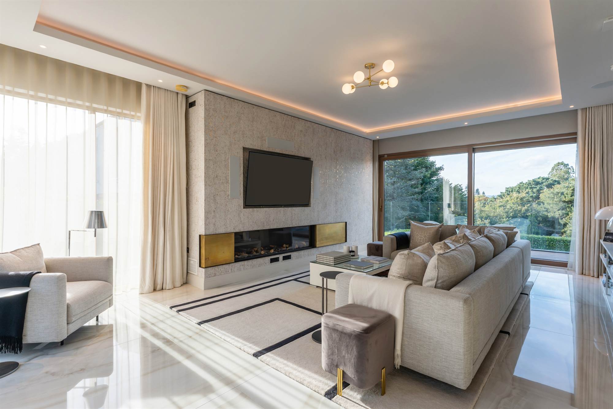 Solid marble floors, double glazed sliding doors to the front accessing morning and afternoon sun patio and to the rear to the balcony overlooking the mature gardens with Belfast Lough in the County Antrim Hills in the background. Feature hand printed wall with built in television area and speaker system, concealed glass fire, concealed speakers and multi function lighting.