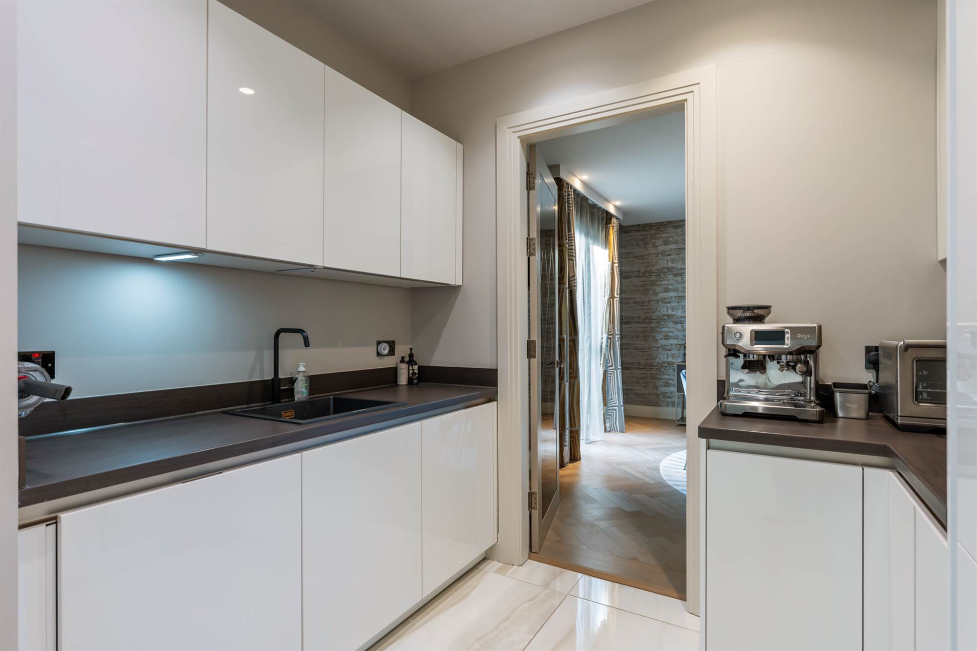 Butler's pantry with fitted sink, worktops, additional dishwasher, walk in storage larders, and door to formal dining room. This concealed room opens into the formal dining room.