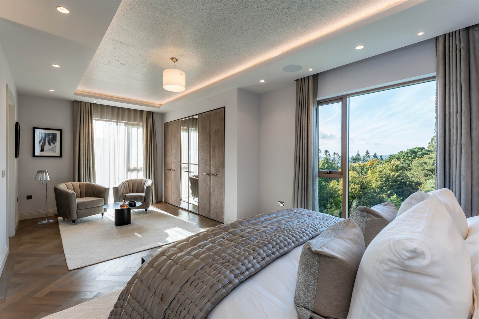 Herringbone solid wooden floor, bespoke built in wardrobes and a full wall of designer built in hanging and drawer storage space with suede and mirrored doors. Ceiling with multi function lighting. A floor to ceiling picture window to the rear overlooking mature green trees, Belfast Lough and the County Antrim hills. A changing area in front of dressing room with chill out area then sliding door to: