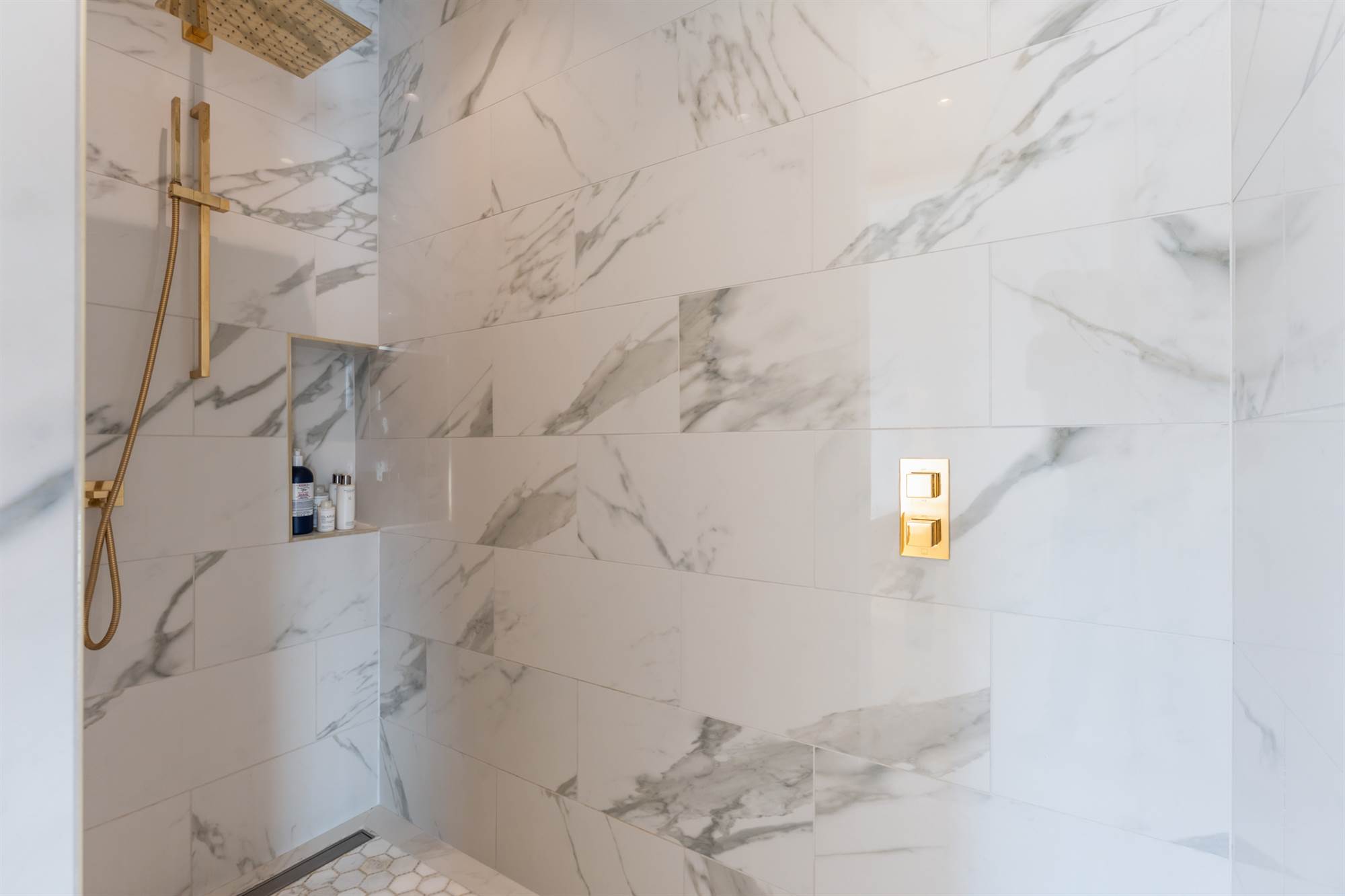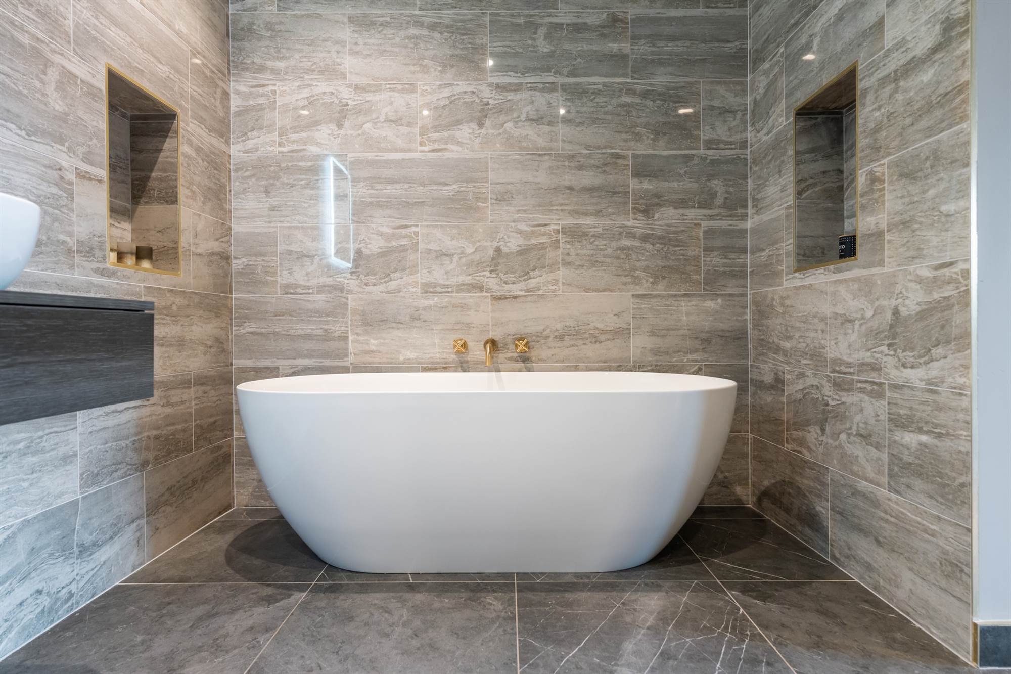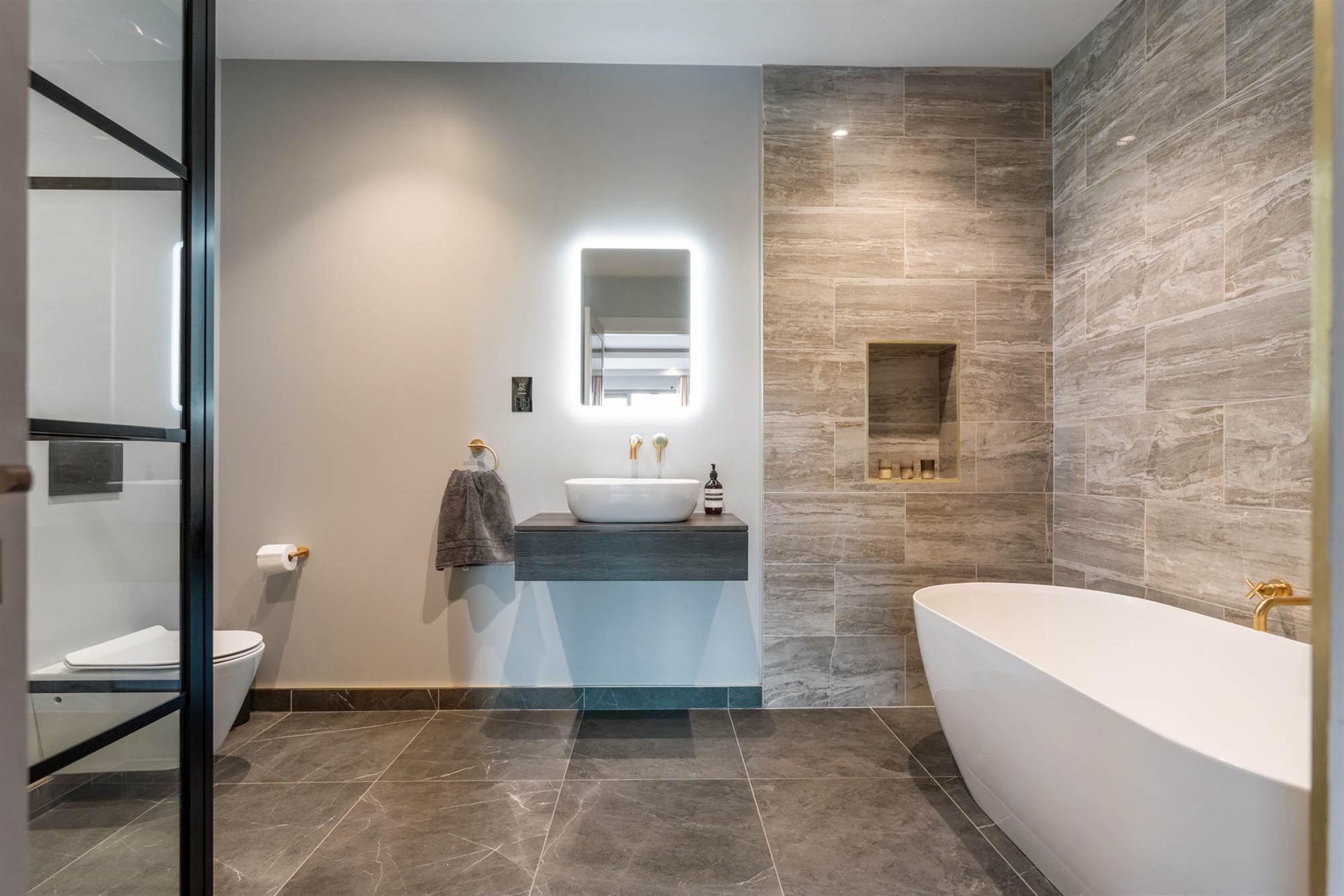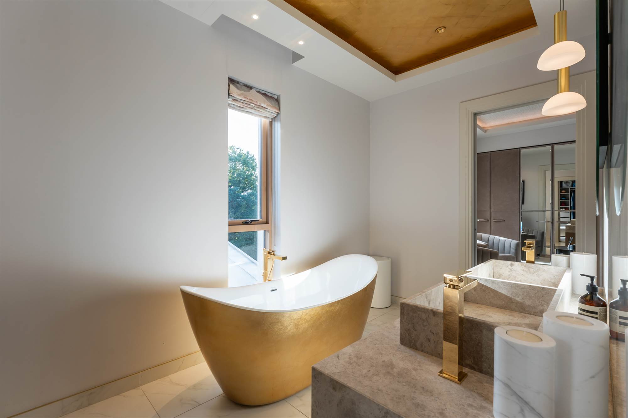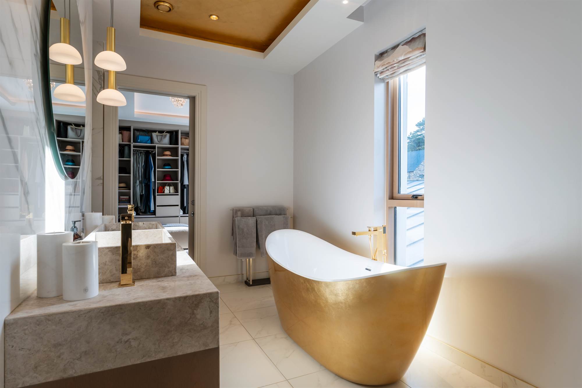 Fully designed bathroom with free standing bath, shower enclosure and double marble sink - leading to: