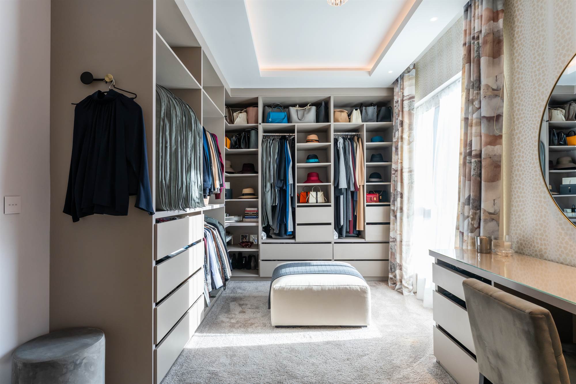 Walk in linen storage cupboard. A discreet hatch with automated Italian manufactured ladder leading to full length and width roof space storage with lighting and fully floored.
