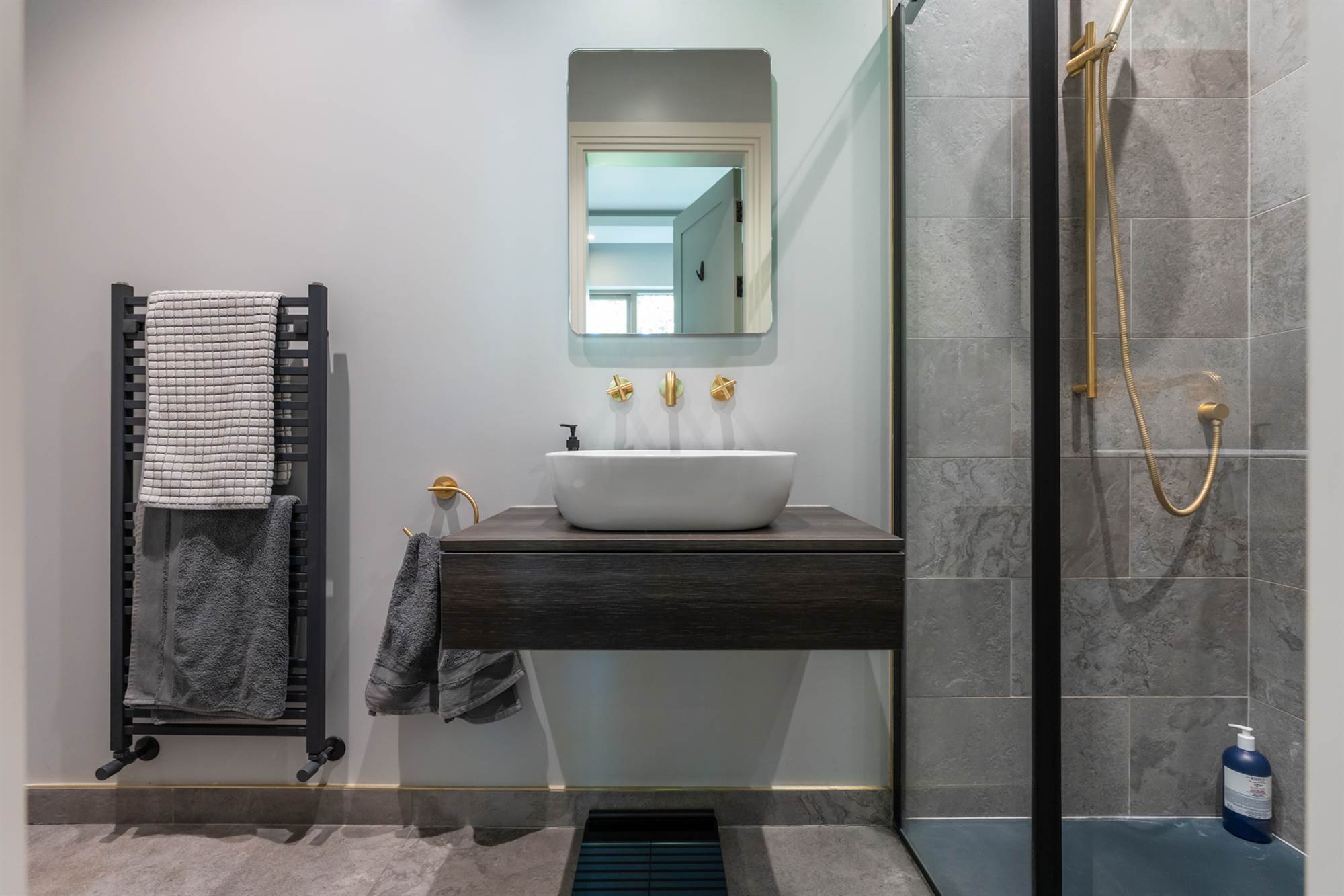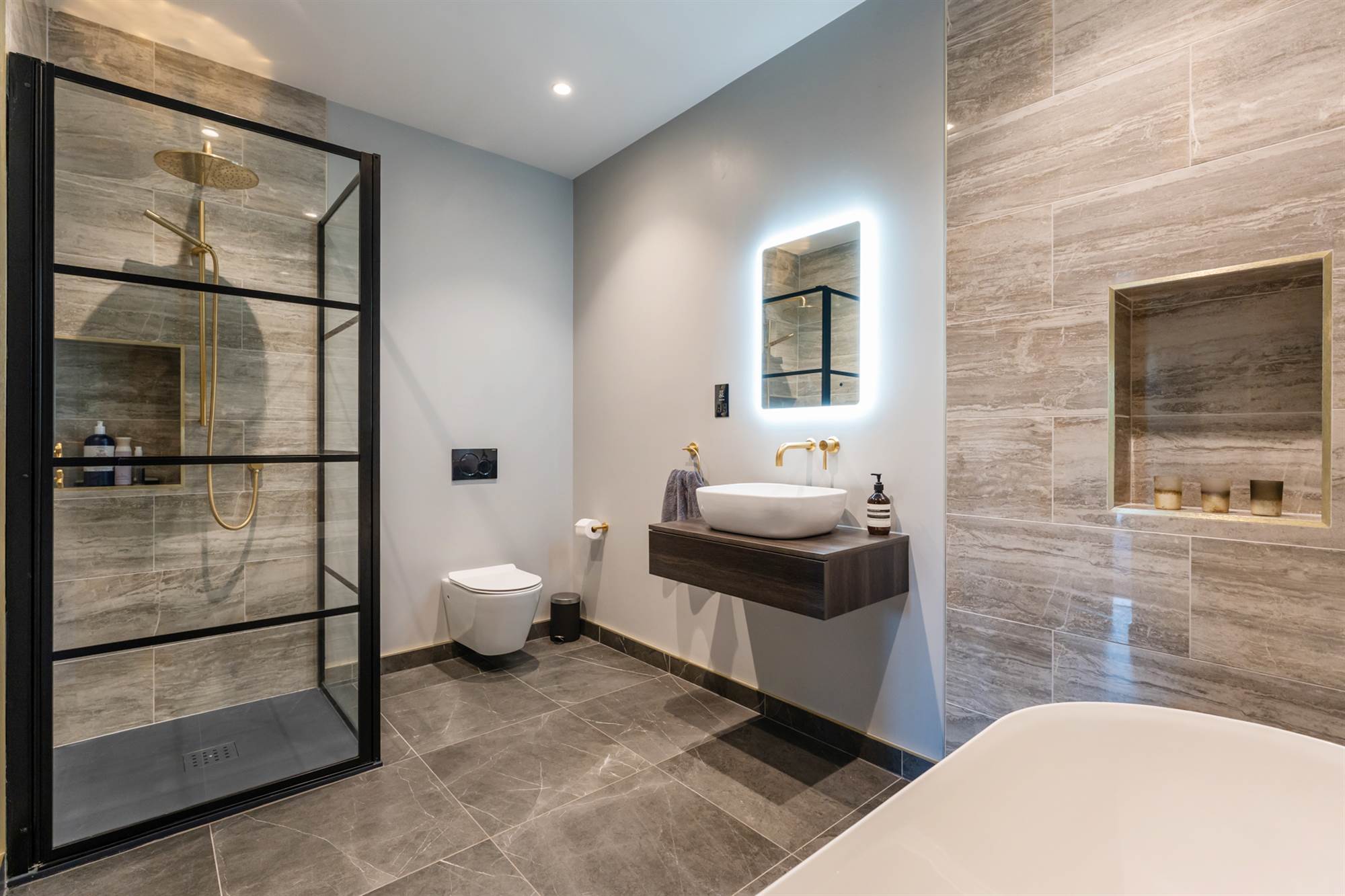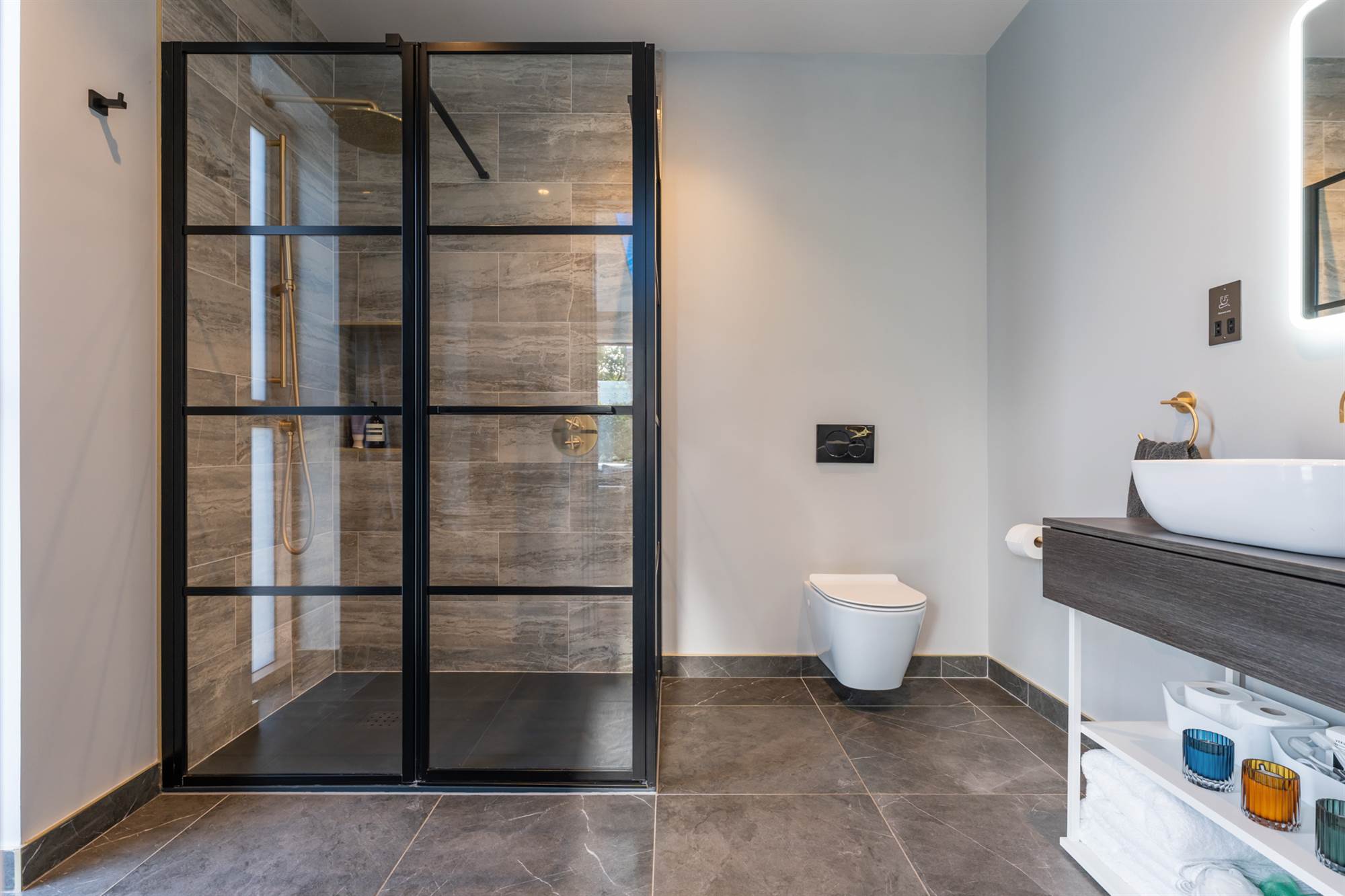 Walk-in shower with slate floor and designer tiled walls with drench shower and telephone hand shower. Heated towel rail, sink with mixer taps in vanity unit. WC with concealed cistern and shaver point, feature lighting, extractor fan.
